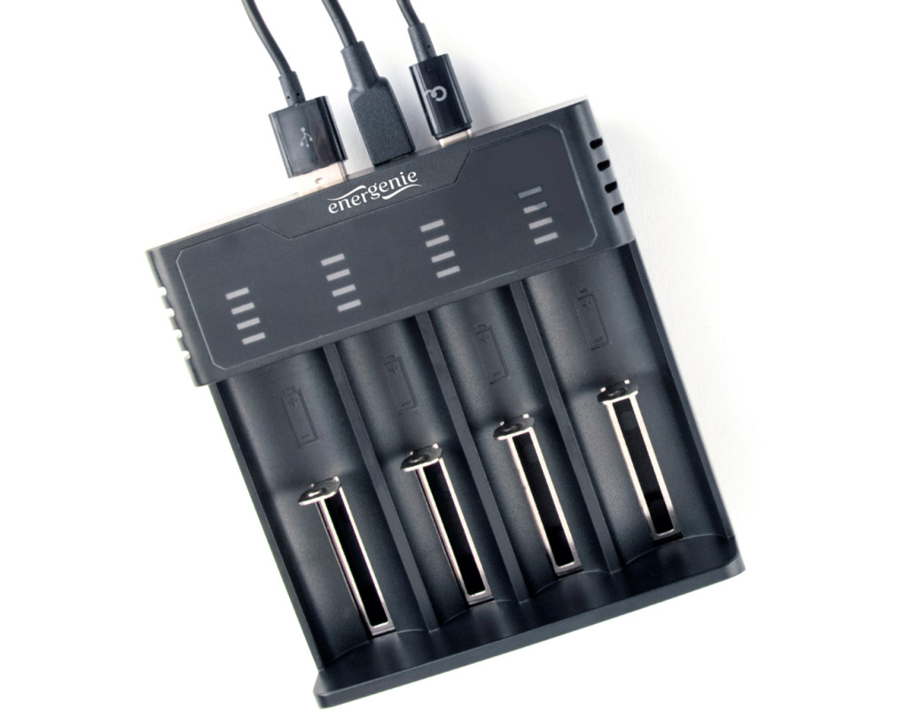 Особливості- Зарядний пристрій на 4 акумулятори: AAA/R03, AA/R6, 10440, 14500, 14650, 16340, 17500, 17670, 18350, 18500, 18650, 18700