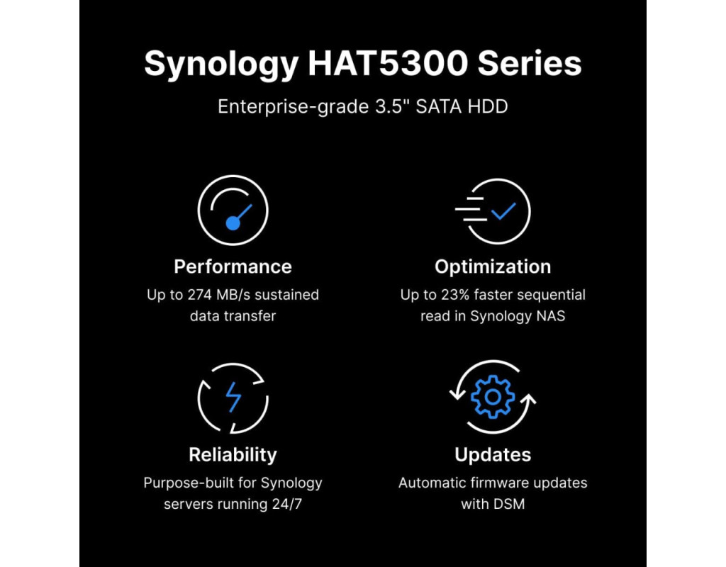 Диски корпоративного класу для систем Synology Жорсткі диски (HDD) Synology HAT5300 забезпечують найкращу у своєму класі продуктивність завдяки ефективній інтеграції з DSM та обладнанням Synology. Завдяки внутрішньому тестуванню тривалістю до 500 000 годин та 5-річної обмеженої гарантії від компанії Synology диски серії HAT5300 забезпечують неперевершену надійність систем Synology. Масштабування для стабільної роботи Завдяки тестуванню та оптимізації жорсткі диски серії HAT5300 забезпечують підвищення продуктивності послідовного читання до 23% у розрахованих на багато користувачів середовищах з ресурсомісткими завданнями. Елемент тестування Завдяки тестуванню на навантаження з пристроями Synology тривалістю понад 500 000 годин диски HAT5300 підходять для корпоративних середовищ з найвищими вимогами та підвищують надійність та продуктивність. Довговічність при цілодобовій експлуатації HDD серії HAT5300 з показником MTTF до 2,5 млн годин підтримують робоче навантаження 550 ТБ на рік, а технологія постійного кешу запису дозволяє мінімізувати пошкодження даних у разі раптової втрати живлення. Просте оновлення мікропрограми Завдяки автоматичному оновленню мікропрограми через DSM та останнім покращенням диски HAT5300 завжди працюють ефективно. |