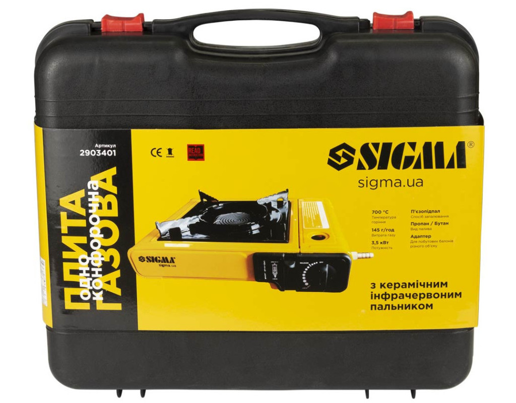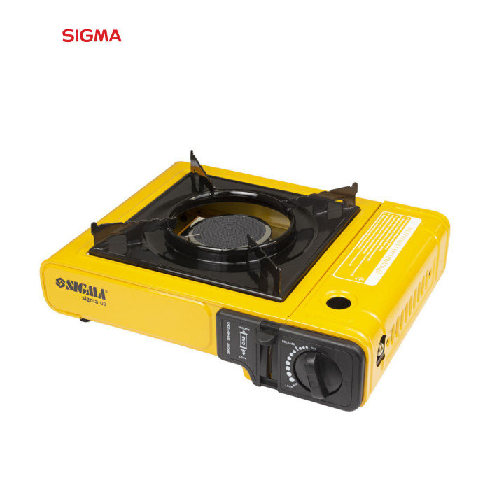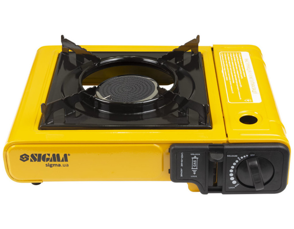 Плита газова одноконфоркова з керамічним інфрачервоним пальником, п'єзопідпалом та адаптером (кейс) Sigma (2903401). Компактна туристична одноконфоркова газова плита з інфрачервоним (практично без відкритого полум'я) керамічним пальником.