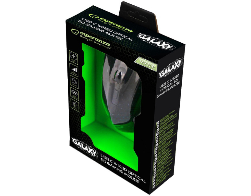 Миша Esperanza MX212 Galaxy створена спеціально для професійних геймерів. Ергономічна форма та матеріали, що використовуються для обробки миші, запобігають втомі рук під час гри. Кнопки "Далі" та "Назад" полегшують навігацію у веб-браузерах, іграх та інших програмах. Високоточний оптичний датчик з роздільною здатністю, що перемикається, забезпечує точне позиціонування курсора в іграх. Миша оснащена кабелем із текстильною обплетенням та посиленим штекером USB-C. |