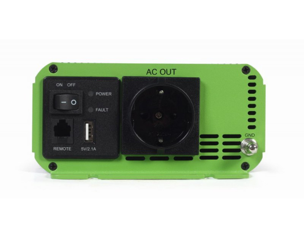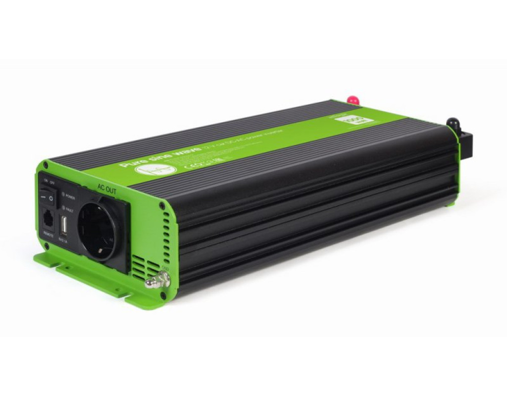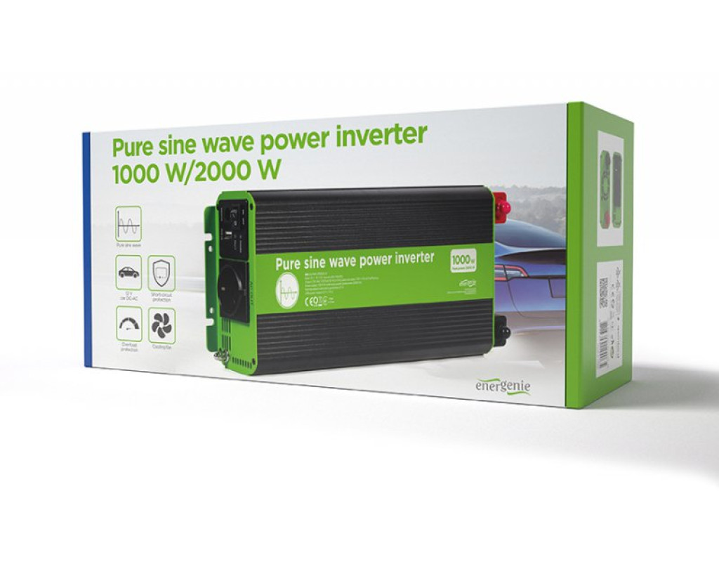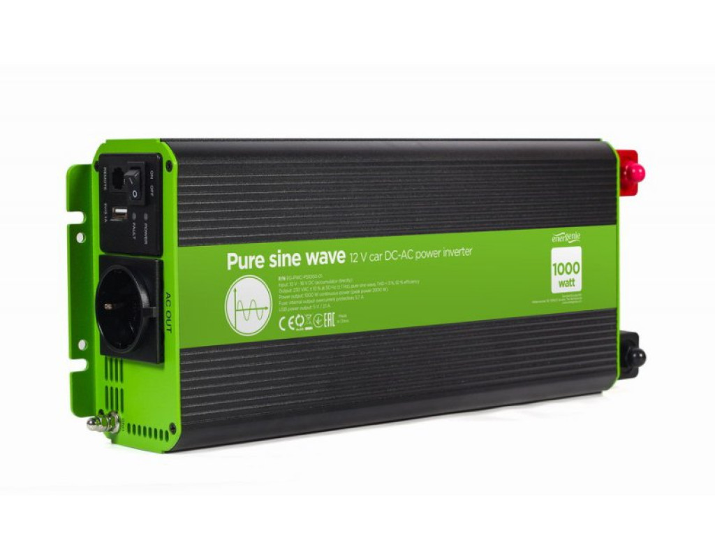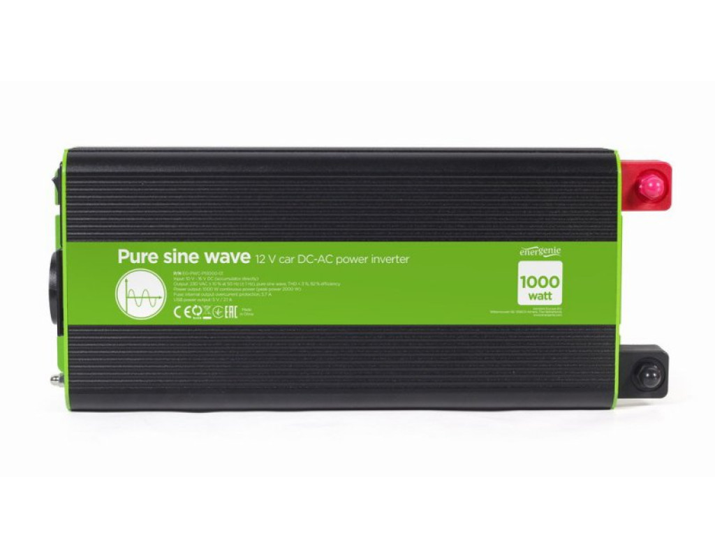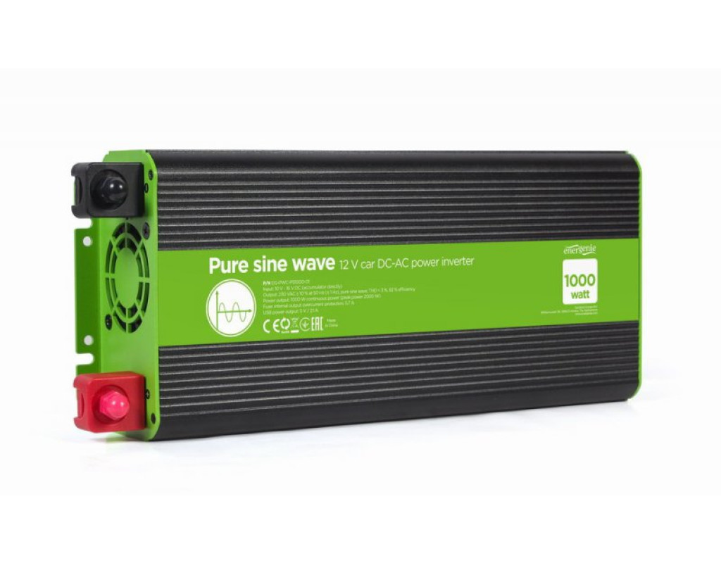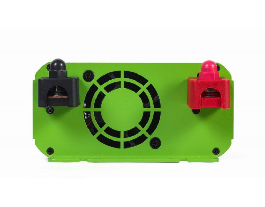 Вхідна напруга - 12 В, Вихідна потужність - 1000 Вт, Вихідна напруга - 230 В, Спосіб підключення - клеми, Синусоіда - чиста, Захист - від перевантаження, від короткого замикання, від переплюсування, активне