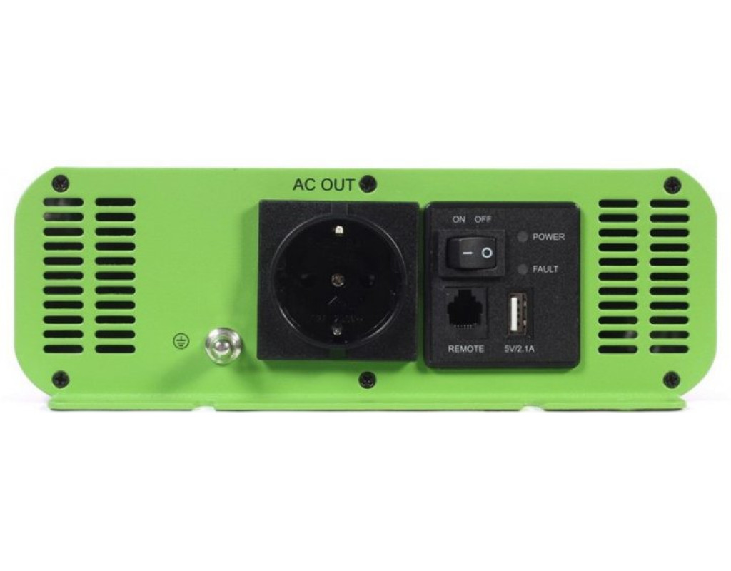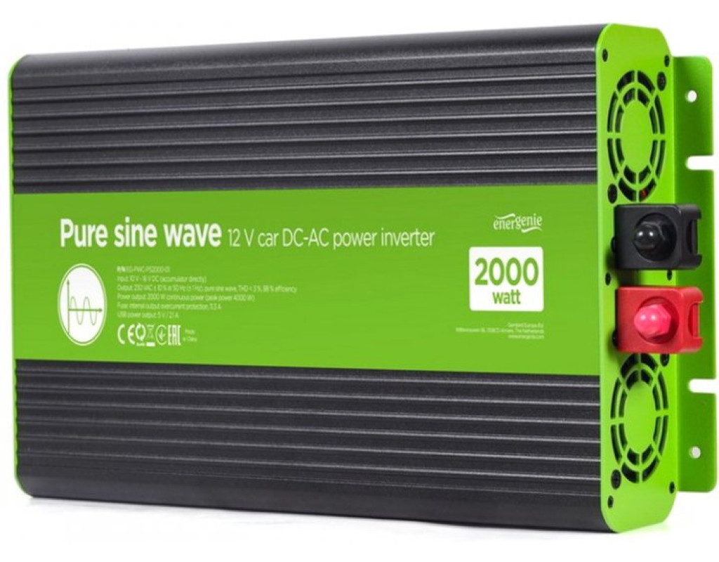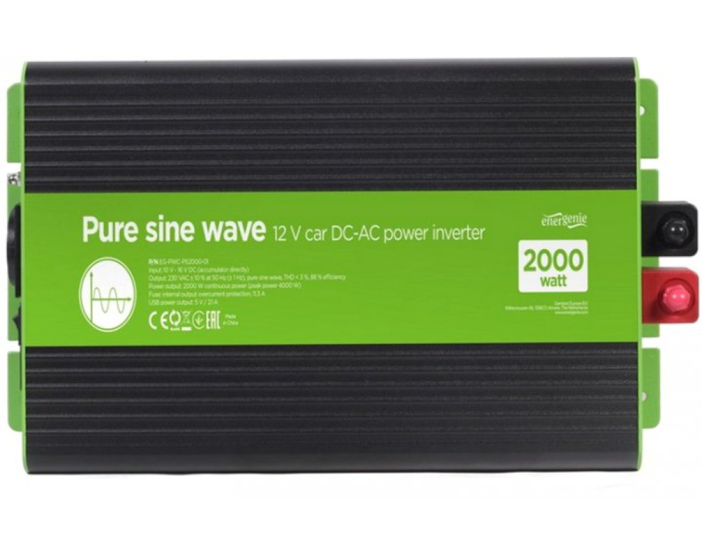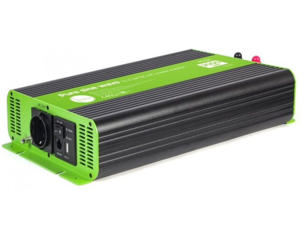 Вхідна напруга - 12 В, Вихідна потужність - 2000 Вт, Вихідна напруга - 230 В, Спосіб підключення - клеми, Синусоіда - чиста, Захист - від перевантаження, від короткого замикання, від переплюсування, активне