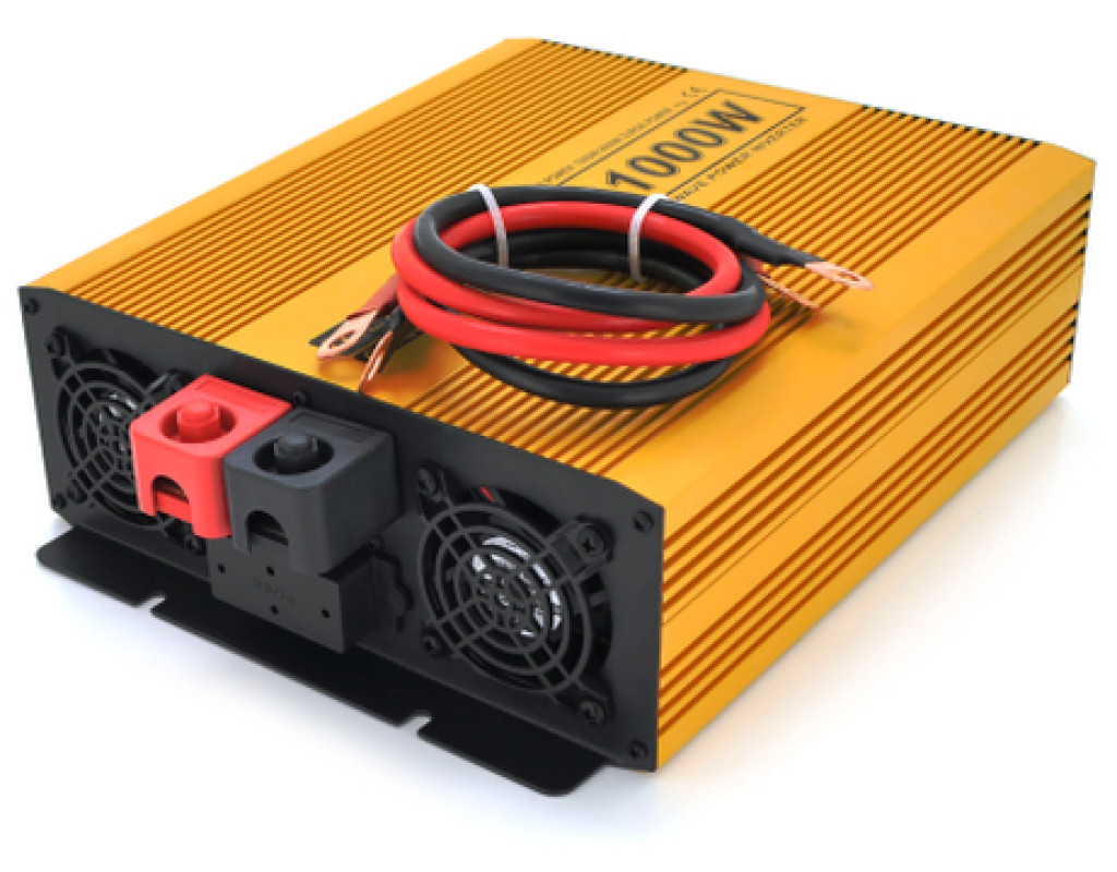 Інвертор напруги MXSPSW-1000-12S - використовується для перетворення електрики 12В на 220В. Дозволяє підключати навантаження до 1000Вт. На лицьовій стороні пристрою розташовані дві розетки, кнопка вкл/викл, світлодіоди. На зворотному боці пристрою клем для підключення проводів акб, вентилятор для активного охолодження пристрою, запобіжники. Особливості: