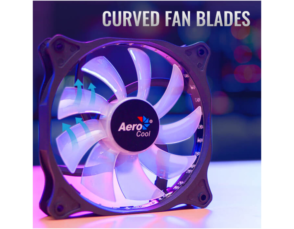 | Статичне RGB підсвічування 18 світлодіодів формують статичне ефектне підсвічування для надання стилю вашому комп'ютеру. Вигнуті лопатіВигнуті лопаті вентилятора ефективно спрямовують потік повітря, збільшуючи тиск повітря та зменшуючи опір повітря для максимальної продуктивності. Напівпрозорі лопаті вентилятора дозволяють оцінити красу RGB освітлення. |