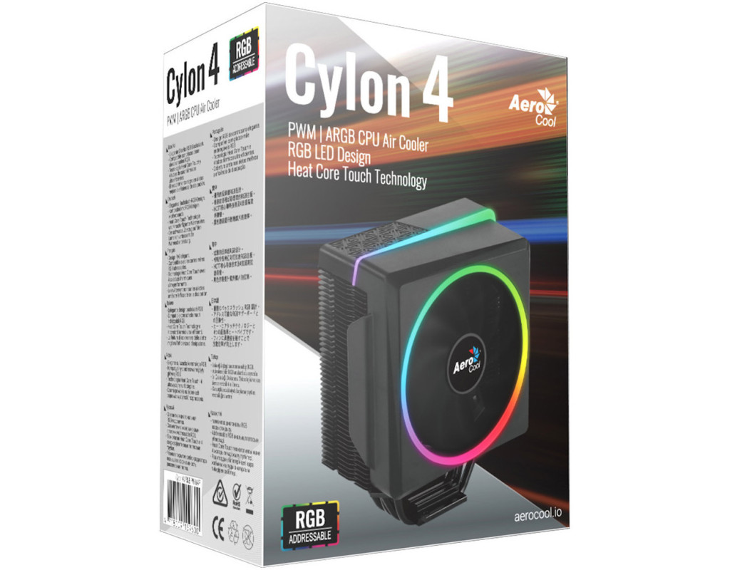 AeroCool Cylon 4 — кулер для процесора з підтримкою ШІМ та ARGB-підсвічуванням на верхній та бічній панелях корпусу. Підтримує технологію Heat Core Touch Technology (HCTT) із застосуванням 4 надефективних теплових трубок. Чорне забарвлення ребер радіатора допомагає краще поглинати тепло та підвищує загальну ефективність охолодження. Верхня панель системи охолодження забезпечує односпрямований рух повітря, щоб прискорити розсіювання тепла від процесора та покращити ефективність охолодження. - RGB-підсвічування на верхній та бічній панелях системи охолодження надає стильного та унікального вигляду всій системі; |
