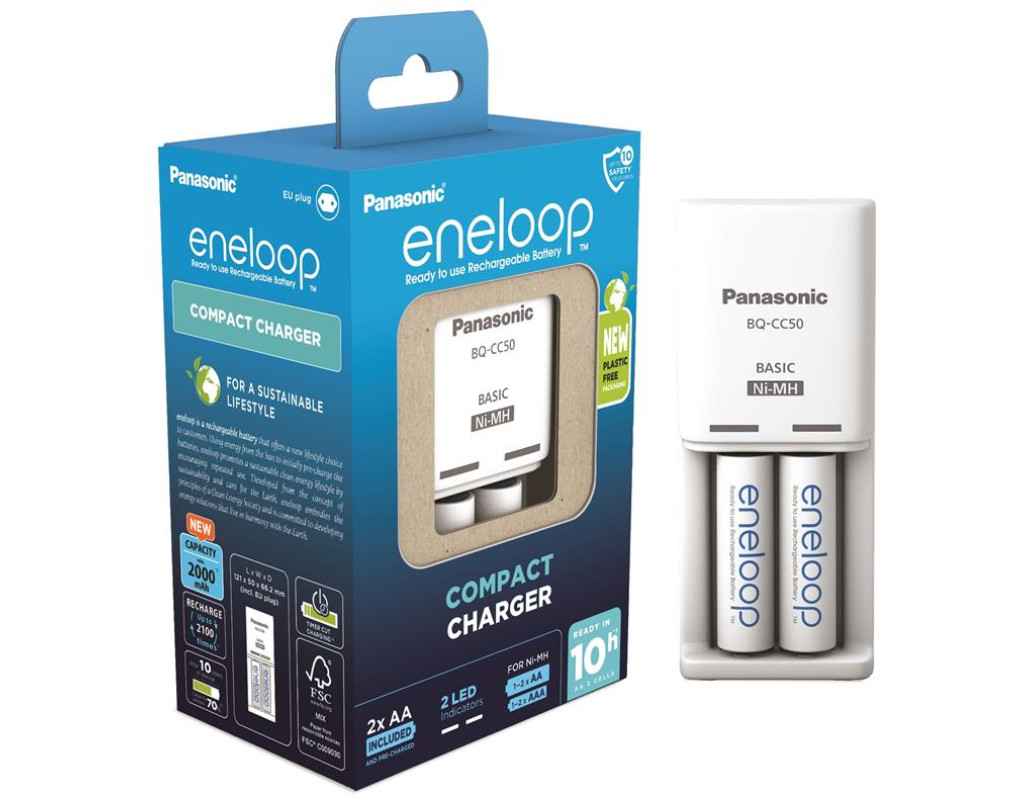 | Зарядний пристрій Compact Charger+ Eneloop 2AA 2000 mAh. Вхідний струм-100-240В 50-60 Гц. Структура вхідного роз'єму - вбудований з перехідником. Зарядний струм (постійний) 3В - 220mA * 2 (AA); 1,5 В -80mA *2 (AAA). Контроль заряджання - таймер (відключення через 13 годин). |