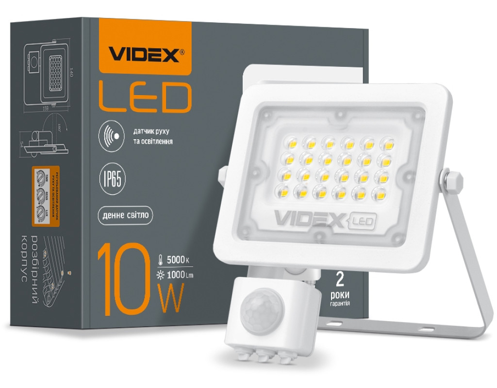 | LED прожектор VIDEX 10W 5000K з датчиком руху та освітленості - високотехнологічне джерело світла. Забезпечує рівний світловий потік і максимальну потужність з першої секунди роботи. Світлодіодний прожектор Videx- екологічна і економічна заміна ламп розжарювання і люмінесцентних ламп. Цей прожектор можливо використовувати для освітлення і підсвічування рекламних вивісок, конструкцій, автостоянок, гаражів, зовнішнього підсвічування будівель і споруд, спортивних майданчиків, стадіонів, промислових об'єктів, створення світлових ефектів. Корпус LED прожектора чудово протистоїть волозі, дощу, снігопадам та іншим погодним опадам. Клас захисту IP65 і високий захист від ударів IK08. Спеціальне захисне покриття збереже прожектор від подряпин під час монтажу або інших неприємностей у процесі експлуатації. Сила світлового потоку-100Лм/В, а сумарний світловий потік прожектора становить 1000Лм. Регульований тепловий датчик руху та освітленості: