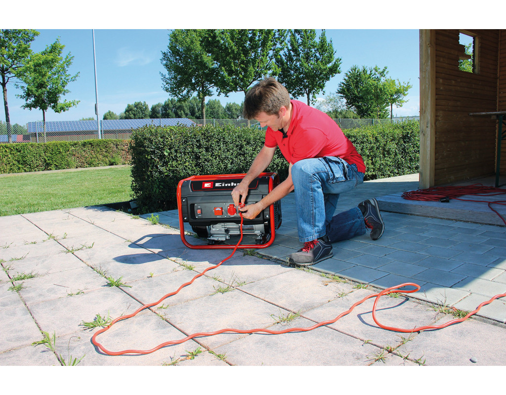 Генератор бензиновий Einhell TC-PG 25/1/E5 забезпечує безперервну потужність 2100 Вт та макс. потужністю 2400 Вт. Генератор приводиться в дію потужним, міцним та малотоксичним 4-тактним двигуном. Завдяки дотриманню норм викидів Е5 чотирьохтактний бензиновий двигун з повітряним охолодженням працює з низьким рівнем викидів. Для передачі електроенергії на кінцеві пристрої має дві розетки на 230, включаючи вольтметр, що показує напругу. Функція АВР (автоматична система контролю напруги) забезпечує стабільну вихідну потужність. Великий 15-літровий бак має індикатор рівня заповнення. Для тривалого використання обладнання має вимикач перевантаження та відключення за низького рівня масла. Генератор запускається простим у використанні тросом. Особливості та переваги генератора Einhell TC-PG 25/1/E5