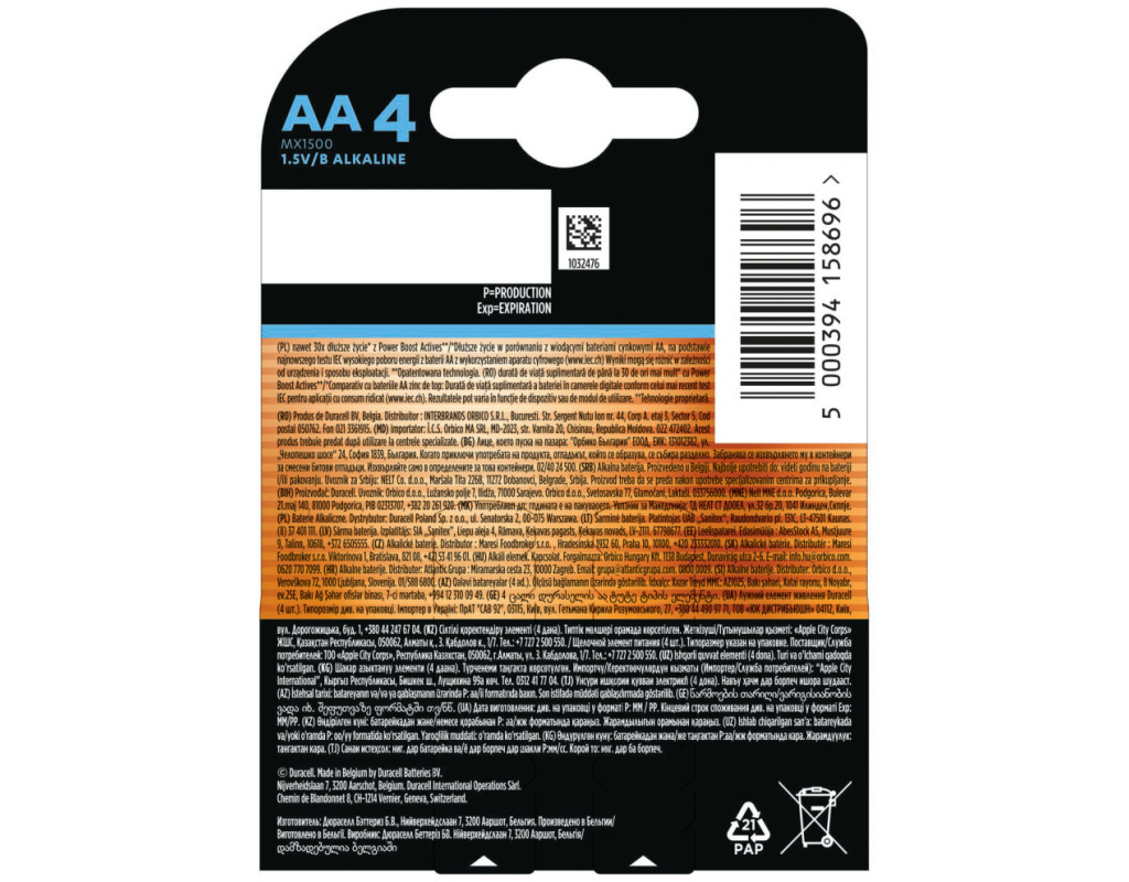 Новий Duracell Optimum. Наша найкраща лужна батарейка типу АА. Найбільш революційна інновація Duracell, абсолютно нова лужна батарейка Duracell Optimum, має нову катодну систему, завдяки якій працює до 30 разів ДОВШЕ¹ в деяких пристроях або ПОТУЖНІШЕ² в інших пристроях. ПРАЦЮЄ ДОВШЕ: Duracell Optimum служить довше, ніж провідні цинкові батарейки, у приладах із середнім і високим споживанням енергії¹. Наприклад, він дозволяє робити до 30 разів більше фотографій за допомогою камери Fujifilm Instax mini 11³ або забазпечує довшу гру за допомогою бездротового контролера XBOX⁴. ПРАЦЮЄ ПОТУЖНІШЕ: у інших пристроях Duracell Optimum забезпечує більше потужності, ніж цинкові батарейки, завдяки чому вони працюють краще² - наприклад, двигуни працюють швидше в таких пристроях, як деякі іграшкові автомобілі з дистанційним керуванням. Ваша викрутка Black + Decker стане потужнішою, завдяки чому ви швидше зберете меблі для самостійної збірки⁵. Оптимальна продуктивність у поєднанні з оптимальною упаковкою Нова та інноваційна упаковка у стилі "книжки" Duracell Optimum містить картонне віконце та органайзер, що означає, що батарейки більше не будуть кататися по кухонному ящику! Натомість ваші батарейки зручно та надійно зберігаються, поки вони вам не знадобляться. А коли батарейки розрядяться, ви можете знову зберігати їх в упаковці, готовими до подальшої переробки. Упаковка на 100% підлягає переробці та не містить пластику. Duracell Optimum. ПРАЦЮЮТЬ ДОВШЕ ¹ або ПОТУЖНІШЕ ² Батарейки Duracell Optimum доступні в розмірах AA, AAA. ¹Довший термін служби порівняно з провідними цинковими батарейками AA: батарейки працюють довше в цифровій камері в порівнянні з тестом 2021 IEC AA з високим рівнем витрати енергії (www.iec.ch) ²АБО батарейки працюють з більшою потужністю у певних пристроях. Результати можуть відрізнятися залежно від пристрою чи способу використання. Дізнайтеся більше на: www.Duracell.info ³Забезпечує довший термін служби камери Fujifilm Instax mini 11 порівняно з провідними цинковими батарейками розміру AA. Результати можуть відрізнятися залежно від пристрою чи способу використання. Дізнайтеся більше на: www.Duracell.info ⁴Забезпечує довший термін служби бездротового контролера Xbox у Forza Motorsports7 порівняно з провідними цинковими батарейками розміру AA. Результати можуть відрізнятися залежно від пристрою чи способу використання. Дізнайтеся більше на: www.Duracell.info ⁵Забезпечує додаткову потужність акумуляторного шуруповерта Black and Decker BCF601 порівняно з провідними цинковими батарейками розміру AA. Результати можуть відрізнятися залежно від пристрою чи способу використання. Дізнайтеся більше на: www.Duracell.info |