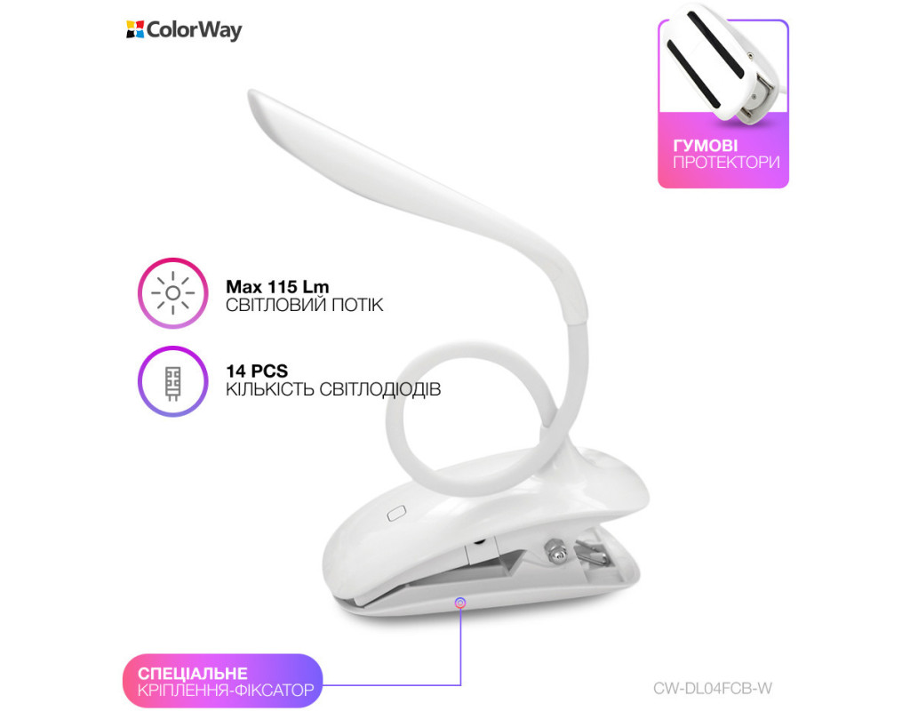 Настільна лампа ColorWay LED Portable & Clip with built-in accumulator Елегантний та компактний дизайн лампи з гнучкою ніжкою та вбудованим акумулятором - робить її по-справжньому портативною та зручною як у використанні, так і у транспортуванні. Ви легко можете покласти її в сумку і брати з собою куди завгодно, що дозволяє мати якісне освітлення під рукою в будь-який момент. Вбудований акумулятор забезпечує від 2 до 5 годин автономної роботи - чого достатньо більшості повсякденних завдань. Для підключення та заряджання не потрібні спеціальні адаптери: достатньо підключити лампу до будь-якого пристрою з USB-роз'ємом, комп'ютера, ноутбука, зарядного пристрою для смартфона або PowerBank. Сенсорна кнопка дозволяє безшумно вмикати та регулювати яскравість освітлення - Використання мінімальної яскравості перетворює лампу на нічник, що створює комфортну атмосферу для сну. Лампа оснащена 14 світлодіодами, які забезпечують рівномірне та м'яке освітлення без відблисків та стробоскопічного ефекту. |