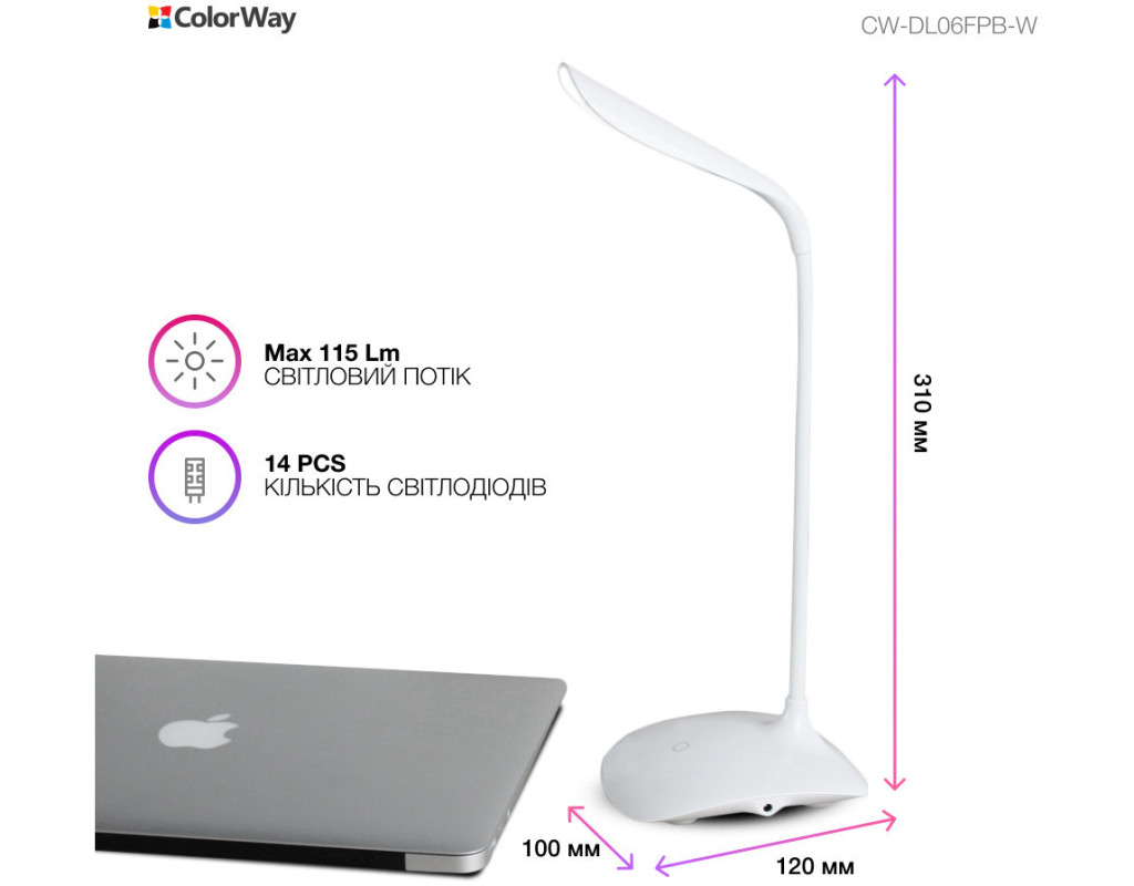 Настільна лампа ColorWay LED Portable & Flexible with built-in accumulator Елегантний та компактний дизайн лампи з гнучкою ніжкою та вбудованим акумулятором - робить її по-справжньому портативною та зручною як у використанні, так і у транспортуванні. Ви легко можете покласти її в сумку і брати з собою куди завгодно, що дозволяє мати якісне освітлення під рукою в будь-який момент. Вбудований акумулятор забезпечує від 2 до 5 годин автономної роботи - чого достатньо більшості повсякденних завдань. Для підключення та заряджання не потрібні спеціальні адаптери: достатньо підключити лампу до будь-якого пристрою з USB-роз'ємом, комп'ютера, ноутбука, зарядного пристрою для смартфона або PowerBank. Сенсорна кнопка дозволяє безшумно вмикати та регулювати яскравість освітлення - Використання мінімальної яскравості перетворює лампу на нічник, що створює комфортну атмосферу для сну. Лампа оснащена 14 світлодіодами, які забезпечують рівномірне та м'яке освітлення без відблисків та стробоскопічного ефекту. |