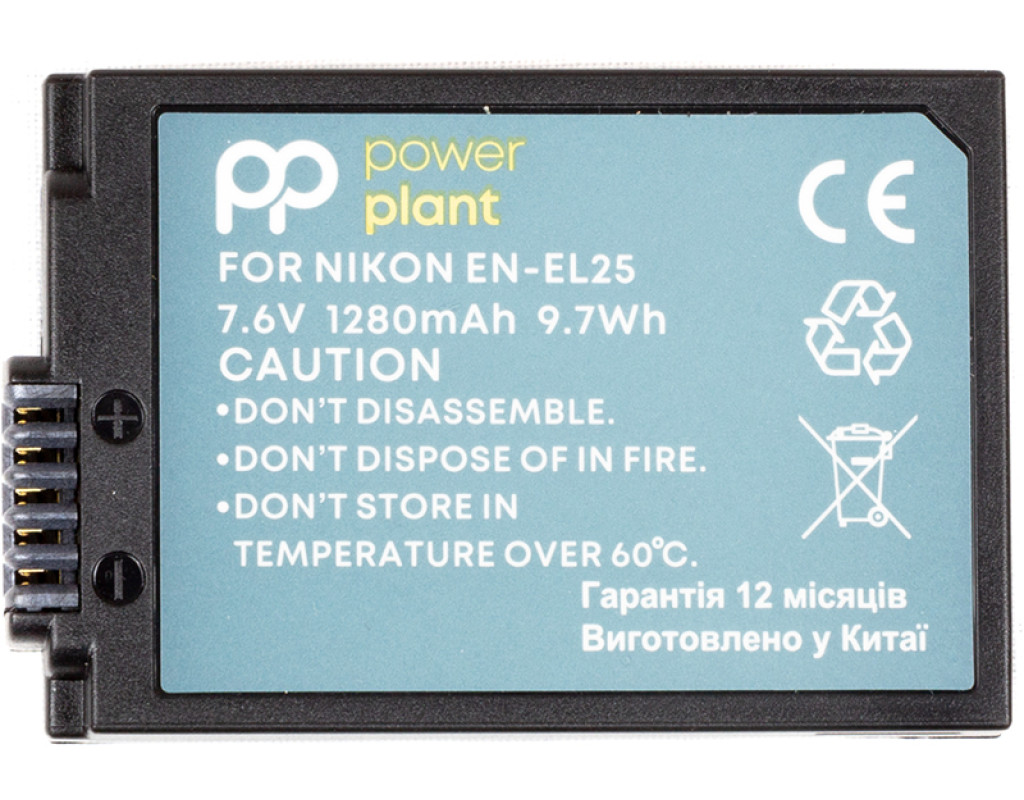 За допомогою акумулятора PowerPlant Nikon EN-EL25 1280mAh (декодований) ви будете убезпечені від розрядки акумулятора в невідповідний момент. Японські чіпи оригінальних виробників фото і відеотехніки, підібрані індивідуально для кожної АКБ, дозволяють сприймати його як рідну батарею і визначати ємність батареї на шкалі індикації рівня заряду. Високоякісні компоненти системи живлення завдяки низькому саморозряду та високій енергетичній щільності забезпечать надійну роботу вашої фото-відео техніки. Компанія PowerPlant впевнена в своїх акумуляторах, тому гарантія на них становить 12 місяців. Назва: PowerPlant Nikon EN-EL25 1280mAh (декодований). Місткість: 1280mAh. Тип акумулятора: Li-ion. Напруга: 7.6V. Потужність: 9.7Wh. Розмір акумулятора: 35x50x20 мм. Вага: 55,4 г. Розмір в упаковці: 45x85x25 мм. Вага в упаковці: 61 г. Виробник: PowerPlant. Гарантія: 12 місяців. Акумулятор можна використовувати замість оригінального: Nikon EN-EL25. Nikon EN-EL25a. Nikon 4241. Підходить до моделей: Nikon Z Series. Nikon Z50 Z 50. Nikon Z FC Mirrorless. |