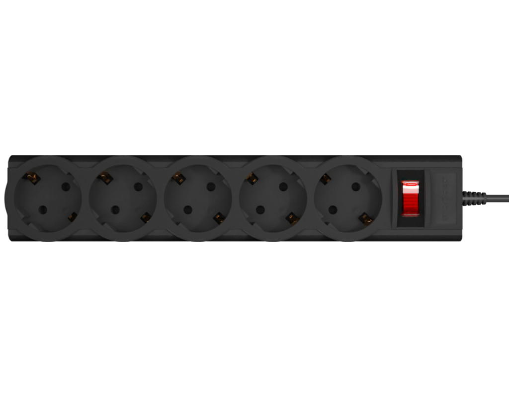 Кількість розеток - 5, Довжина кабелю - 2 м, заземлюючий контакт, із загальним вимикачем, Сумарна потужність підключеного навантаження - < 3500 Вт, RTL, Колір - чорний