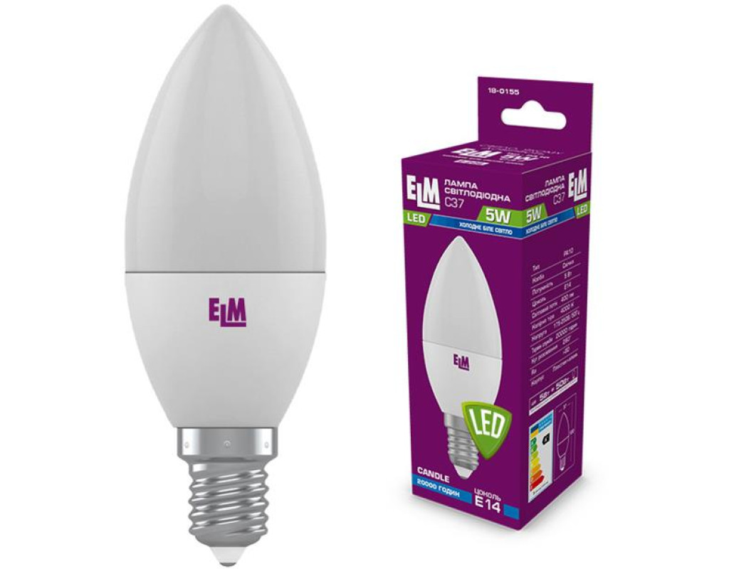 | Лампа світлодіодна свічка ELM 5W E14 4000K 18-0155 відрізняється досить хорошим світловим потоком в 400 lm і має світловіддачу понад 80 лм/Вт при потужності лише 5 Вт. Її кут розсіювання великий і становить 260 градусів, а перенесення кольорів дорівнює Ra > 80. Колірна температура лампочок цієї моделі — 4000 градусів по Кельвіну, що дає чисте біле світло.