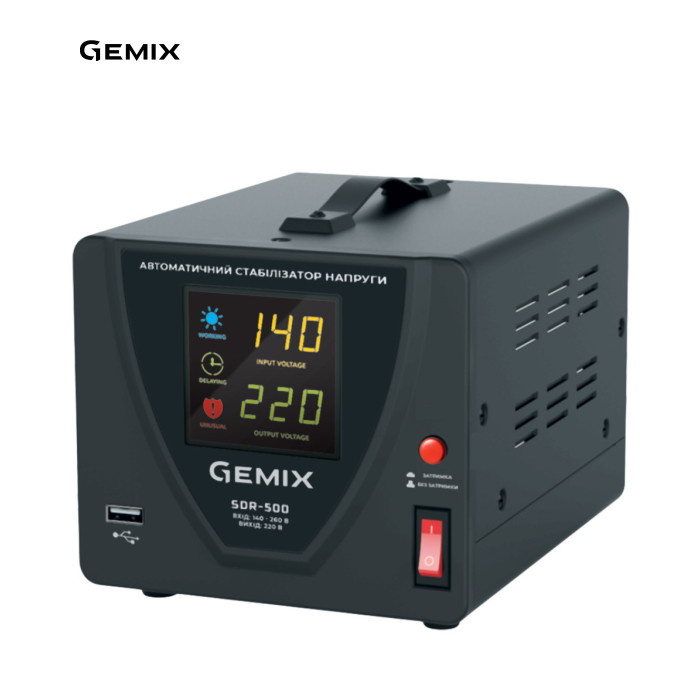 Стабілізатори релейного типу GEMIX SDR-500 призначені для підтримки стабільної напруги в однофазних мережах 220В та частотою 50 Гц, для живлення AV, комп'ютерної техніки та побутових приладів. Похибка стабілізації на виході становить 8% для діапазону вхідної напруги 204-236В і 10% для 198-242В. Розглянутий стабілізатор напруги не потребує додаткового монтажу завдяки зручній конструкції полочного типу. Особливості серії SDR:
