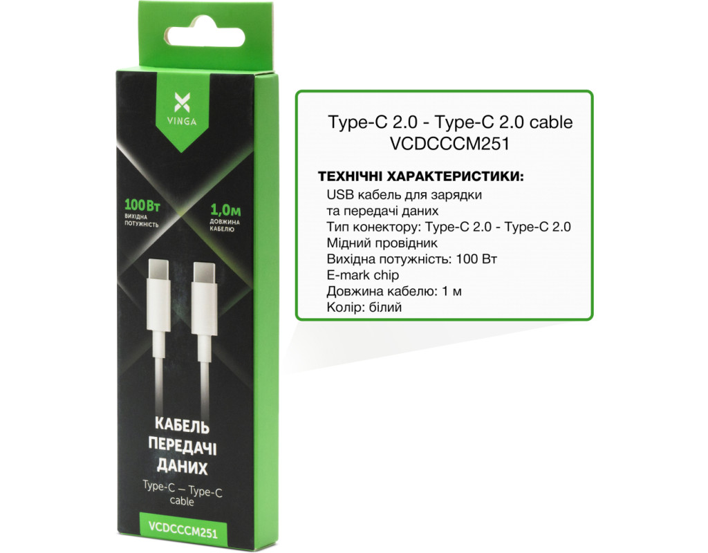Дата кабель USB-C to USB-C 1.0m 100W E-Mark chip PVC Vinga (VCDCCCM251)