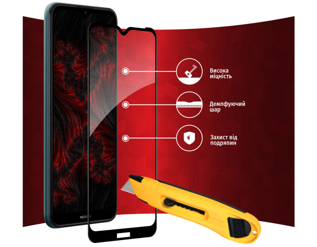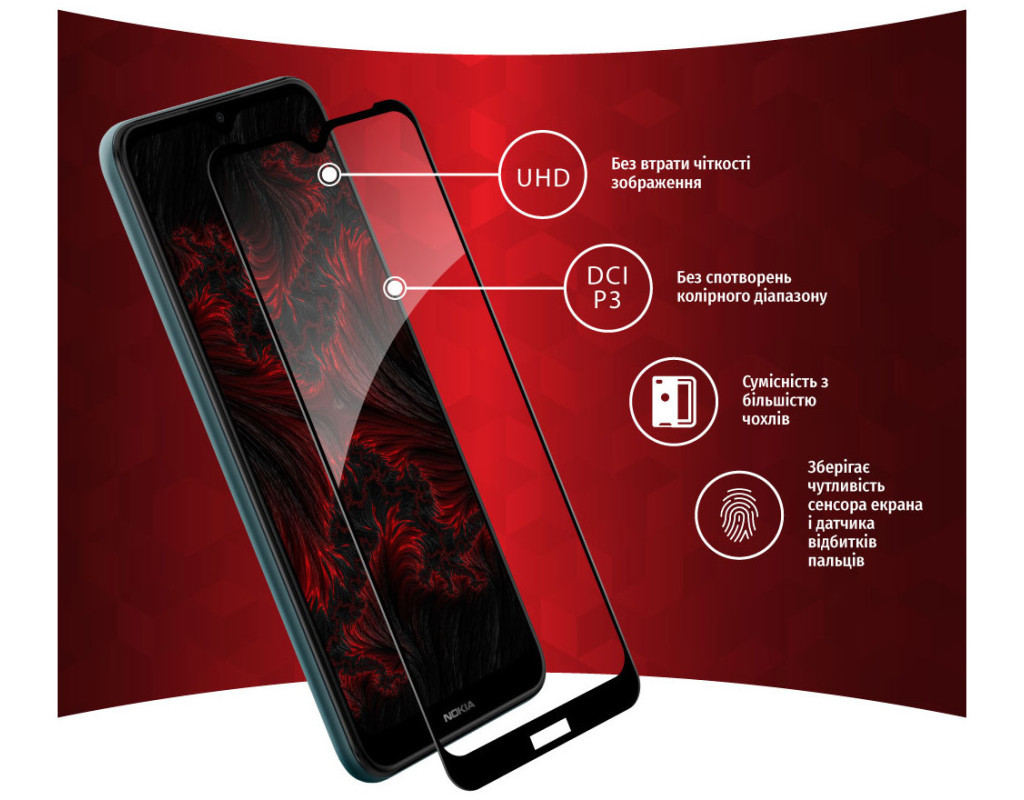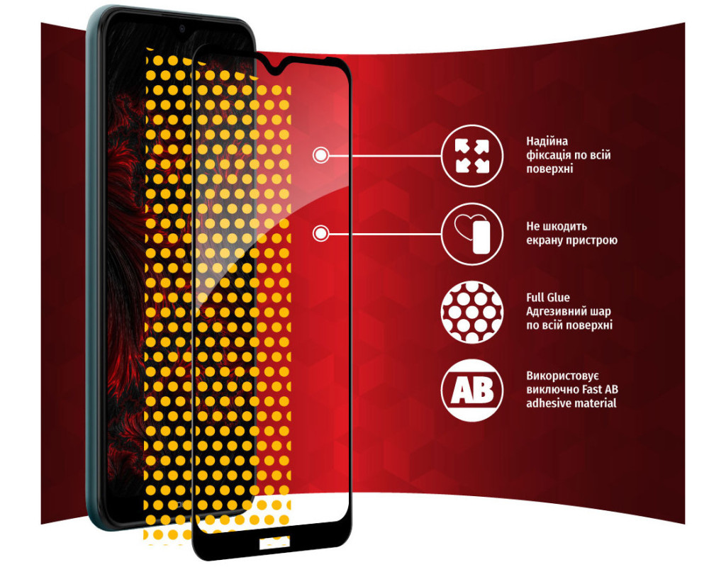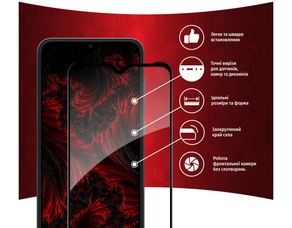 Захисне загартоване скло — один із найкращих засобів захисту не тільки екрана, але й усієї передньої панелі мобільного пристрою, від краю до краю. Воно повністю повторює розміри та форму передньої панелі смартфонів навіть із закругленими краями. Краї скла повторюють колір передньої панелі, тому скло майже невидиме для ока. Скло надійно оберігає від ударів або падінь. Ключові особливості: