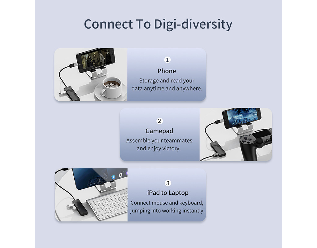 - Підтримує різні USB-пристрої: мишу, клавіатуру, USB-накопичувач, принтер, кардрідер, портативний жорсткий диск, кулер для ПК, невеликий вентилятор. Не підключайте потужні USB-пристрої, концентратор не підтримує заряджання від USB.