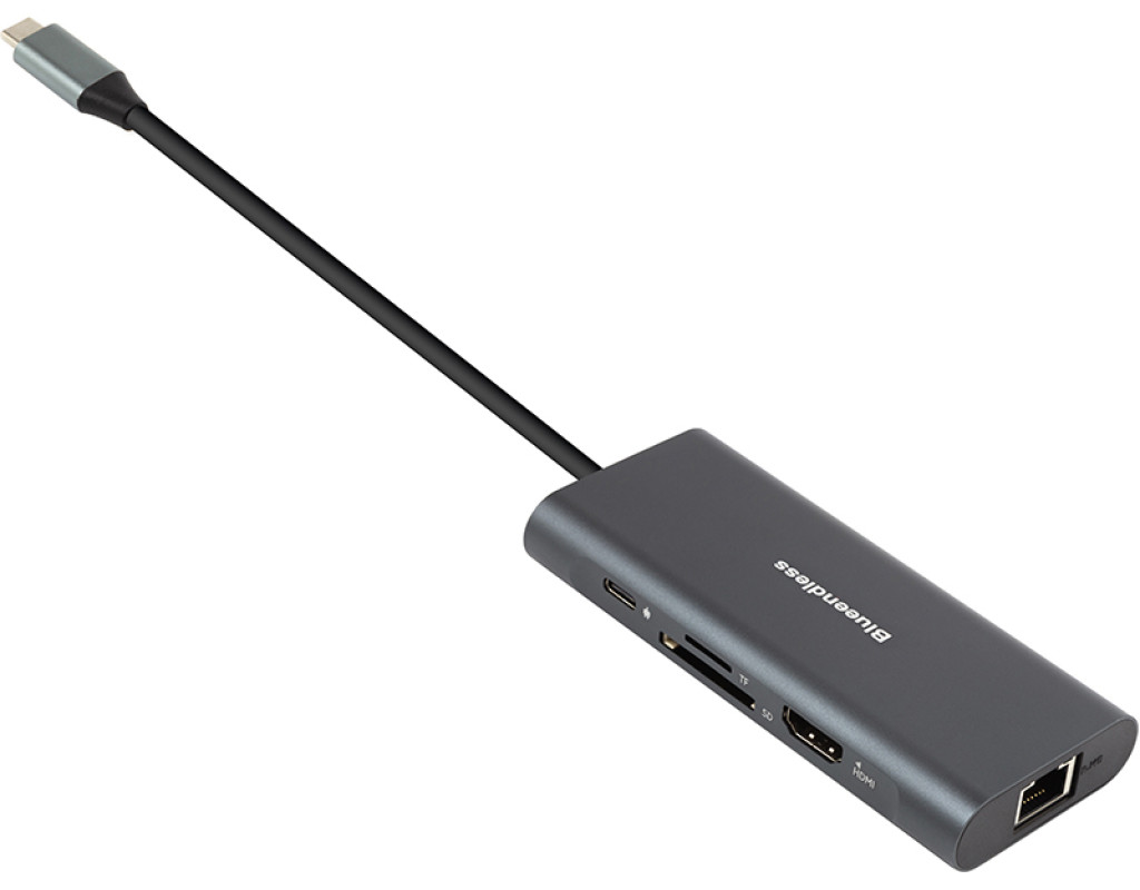 Адаптер USB C на 2 порти USB 3.0, USB 2.0, HDMI, Type C, має слоти для карток SD та TF та роз'єм RJ45. Можливості: Порт USB 3.0 підтримує швидкість передачі даних 5 Гбіт/с, що дозволяє передавати HD-фільми за лічені секунди. Роз'єм типу C дозволяє заряджати телефон або інше обладнання за допомогою потужності ноутбука. Має надзвичайно швидку можливість заряджання до 100 Вт. З'єднання HDMI спрощує потокову передачу відео з телефону чи комп'ютера на телевізор чи проектор. Адаптер забезпечує доступ до карток SD або TF. Підтримує картки microSD, microSDHC, microSDXC, SD, SDHC, SDXC. Адаптер сумісний із операційними системами Windows, Mac OS та Android. Підтримує захист від перенапруги. Алюмінієвий корпус. |