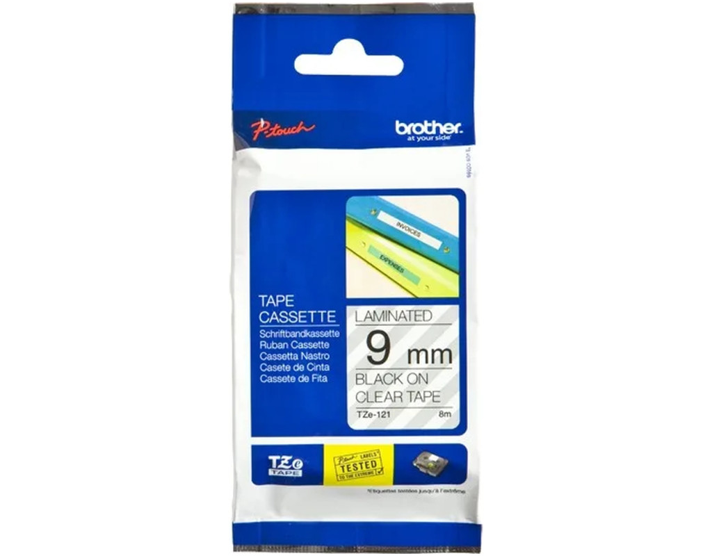 Brother 9mm, Laminated clear, Print black (TZE121) - ламінована клейка стрічка.