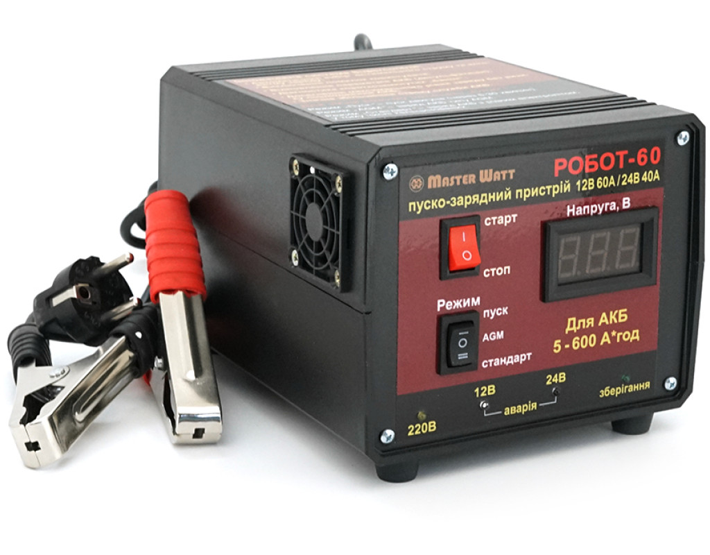Пуско-зарядне ЗУ РОБОТ-60 для акумуляторів 12 / 24V (5-600Ah) (MF, WET, AGM, GEL, CA / CA), 160-245V, Струм заряду 40А, крокодили в комплекті