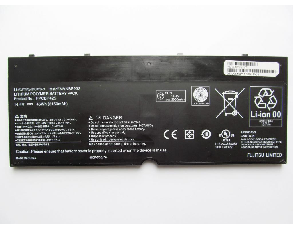Дана акумуляторна батарея може мати такі маркування (або PartNumber): FMVNBP232, FPCBP425, FPB0315S, CP651077-02 Акумуляторна батарея підходить для наступних моделей ноутбуків: Fujitsu LifeBook T904, T904U, T935, U745 У зв'язку з динамічно розвиваючимися технологіями і регулярно оновлюваними лінійками ноутбуків, всі вищевказані списки можуть бути не повними.