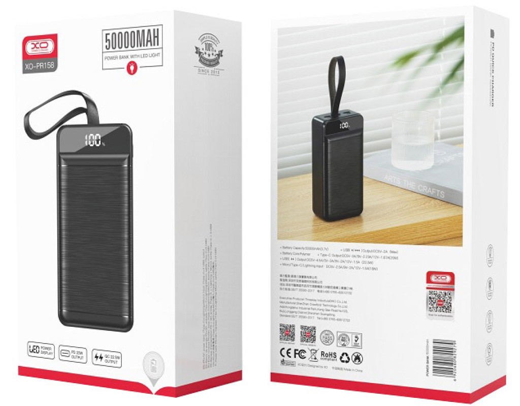 Power Bank XO PR158 - потужний, функціональний зовнішній акумулятор ємністю 50000mAh, доповнений яскравим ліхтарем, що робить його чудовим вибором для використання в походах. Модель виконана в стильному, практичному дизайні, текстурована лицьова панель та виділений дисплей, що відображає рівень заряду, надають їй привабливості та забезпечать користувачеві приємні тактильні відчуття. Комфорт у повсякденну експлуатацію внесе зручний, міцний ремінець. Для виготовлення аксесуарів використовуються якісні електронні компоненти, вогнестійкі полікарбонат та ABS пластик. Високоякісний акумулятор забезпечує стабільну роботу, тривалий термін служби та безпеку. |