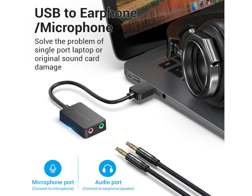 Звукова карта USB AUX jack, 2*TRS (Mic + Ear) 0.15м Vention чорна