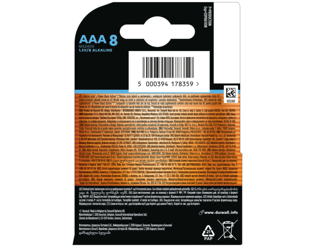 Новий Duracell Optimum. Наша найкраща лужна батарейка AAA Найбільш революційна інновація Duracell, абсолютно нова лужна батарейка Duracell Optimum, має нову катодну систему, завдяки якій працює ДОВШЕ¹ в деяких пристроях або ПОТУЖНІШЕ² в інших пристроях. ПРАЦЮЄ ДОВШЕ: Duracell Optimum AAA служить довше в деяких пристроях, таких як іграшки³. А батарейки з довшим терміном служби означають тривале задоволення для всіх користувачів пристрою. ПРАЦЮЄ ПОТУЖНІШЕ: у інших пристроях Duracell Optimum AAA забезпечує більше потужності, ніж провідні цинкові батарейки, завдяки чому вони працюють краще² - наприклад, двигуни працюють швидше в таких пристроях, як деякі іграшкові автомобілі з дистанційним керуванням (вантажівка Spinmaster Monster Jam, офіційна радіокерована вантажівка-монстр у масштабі 1:24) ⁴. Оптимальна продуктивність у поєднанні з оптимальною упаковкою Нова та інноваційна упаковка у стилі "книжки" Duracell Optimum містить картонне віконце та органайзер, що означає, що батарейки більше не будуть кататися по кухонному ящику! Натомість ваші батарейки зручно та надійно зберігаються, поки вони вам не знадобляться. А коли батарейки розрядяться, ви можете знову зберігати їх в упаковці, готовими до подальшої переробки. Упаковка на 100% підлягає переробці та не містить пластику. Duracell Optimum. ПРАЦЮЮТЬ ДОВШЕ ¹ або ПОТУЖНІШЕ ² Батарейки Duracell Optimum доступні в розмірах AA, AAA. ¹ Забезпечує довший термін служби порівняно з провідними цинковими батарейками AAA: додатковий термін служби в тесті іграшок IEC AAA 2021 (www.iec.ch). ²АБО батарейки працюють з більшою потужністю у певних пристроях. Результати можуть відрізнятися залежно від пристрою чи способу використання. Дізнайтеся більше на: www.Duracell.info ³Забезпечує довший термін служби батарейок розміру AAA порівняно з мінімальною середньою тривалістю у тесті іграшок IEC 2021 (www.iec.ch) ⁴Забезпечує додаткову потужність в офіційній монстр-вантажівці з дистанційним керуванням Spin Master Monster Jam Official Grave Digger, масштаб 1:24, 2,4 ГГц, номер продукту 6047111/604495 порівняно з провідними цинковими батарейками AAA. Результати можуть відрізнятися залежно від пристрою чи способу використання. Дізнайтеся більше на: www.Duracell.info |
