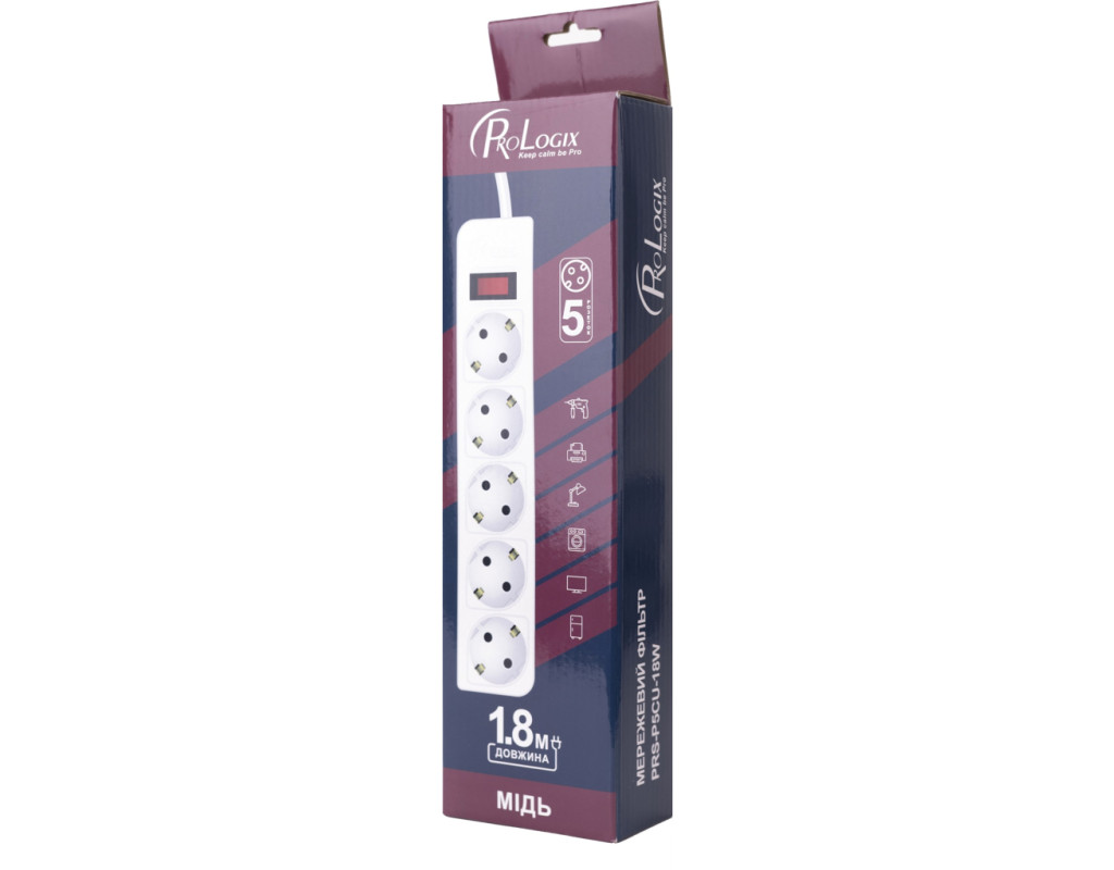 | Фільтр живлення PRS-P5CU-18W торгової марки ProLogix використовується для підключення великої побутової техніки, побутової електроніки та електроінструменту. Удароміцний корпус з негорючого та нетоксичного пластику, має вбудований захист від перевантажень та короткого замикання. Мережевий фільтр простий та зручний у використанні. За допомогою загального вимикача зі світловим індикатором можна активувати або вимкнути всі підключені гаджети або пристрої одночасно. Основні характеристики:
