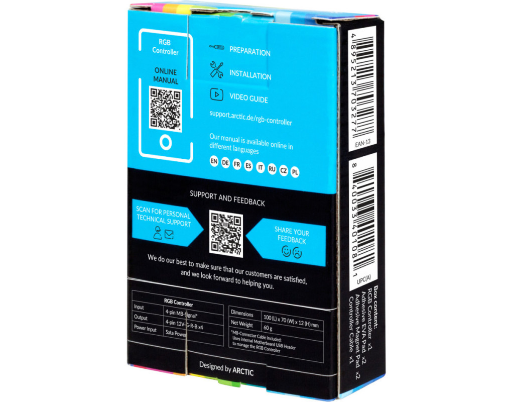 | Інтуїтивно зрозуміле програмне забезпечення RGB-контролер підключається до материнської плати через внутрішній USB-роз'єм і керується програмним забезпеченням Arctic RGB. Без використання програмного забезпечення весь колірний спектр відтворюється послідовно. Повний контроль навіть без материнської плати з підтримкою RGBRGB-контролер функціонує повністю незалежно і дозволяє керувати RGB-продуктами навіть без відповідної материнської плати. Він просто підключається до материнської плати через внутрішній USB-роз'єм. 4 автономні 4-контактні роз'ємиRGB-контролер має чотири стандартизовані 4-контактні роз'єми RGB, які можна використовувати для підключення та керування не лише власними RGB-пристроями ARCTIC. Їх можна синхронізувати або керувати ними незалежно один від одного. Універсальний вибір ефектівКонтролер має кілька попередньо налаштованих і регульованих режимів освітлення. Це дозволяє індивідуально адаптувати освітлення системи до власного смаку. Серед попередньо встановлених режимів — «Веселка», «Дихання», «Зміна кольору» та «Музика». |