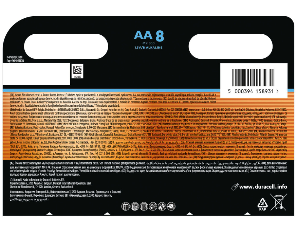 Новий Duracell Optimum. Наша найкраща лужна батарейка AAA Найбільш революційна інновація Duracell, абсолютно нова лужна батарейка Duracell Optimum, має нову катодну систему, завдяки якій працює ДОВШЕ¹ в деяких пристроях або ПОТУЖНІШЕ² в інших пристроях. ПРАЦЮЄ ДОВШЕ: Duracell Optimum AAA служить довше в деяких пристроях, таких як іграшки³. А батарейки з довшим терміном служби означають тривале задоволення для всіх користувачів пристрою. ПРАЦЮЄ ПОТУЖНІШЕ: у інших пристроях Duracell Optimum AAA забезпечує більше потужності, ніж провідні цинкові батарейки, завдяки чому вони працюють краще² - наприклад, двигуни працюють швидше в таких пристроях, як деякі іграшкові автомобілі з дистанційним керуванням (вантажівка Spinmaster Monster Jam, офіційна радіокерована вантажівка-монстр у масштабі 1:24) ⁴. Оптимальна продуктивність у поєднанні з оптимальною упаковкою Нова та інноваційна упаковка у стилі "книжки" Duracell Optimum містить картонне віконце та органайзер, що означає, що батарейки більше не будуть кататися по кухонному ящику! Натомість ваші батарейки зручно та надійно зберігаються, поки вони вам не знадобляться. А коли батарейки розрядяться, ви можете знову зберігати їх в упаковці, готовими до подальшої переробки. Упаковка на 100% підлягає переробці та не містить пластику. Duracell Optimum. ПРАЦЮЮТЬ ДОВШЕ ¹ або ПОТУЖНІШЕ ² Батарейки Duracell Optimum доступні в розмірах AA, AAA. ¹ Забезпечує довший термін служби порівняно з провідними цинковими батарейками AAA: додатковий термін служби в тесті іграшок IEC AAA 2021 (www.iec.ch). ²АБО батарейки працюють з більшою потужністю у певних пристроях. Результати можуть відрізнятися залежно від пристрою чи способу використання. Дізнайтеся більше на: www.Duracell.info ³Забезпечує довший термін служби батарейок розміру AAA порівняно з мінімальною середньою тривалістю у тесті іграшок IEC 2021 (www.iec.ch) ⁴Забезпечує додаткову потужність в офіційній монстр-вантажівці з дистанційним керуванням Spin Master Monster Jam Official Grave Digger, масштаб 1:24, 2,4 ГГц, номер продукту 6047111/604495 порівняно з провідними цинковими батарейками AAA. Результати можуть відрізнятися залежно від пристрою чи способу використання. Дізнайтеся більше на: www.Duracell.info |