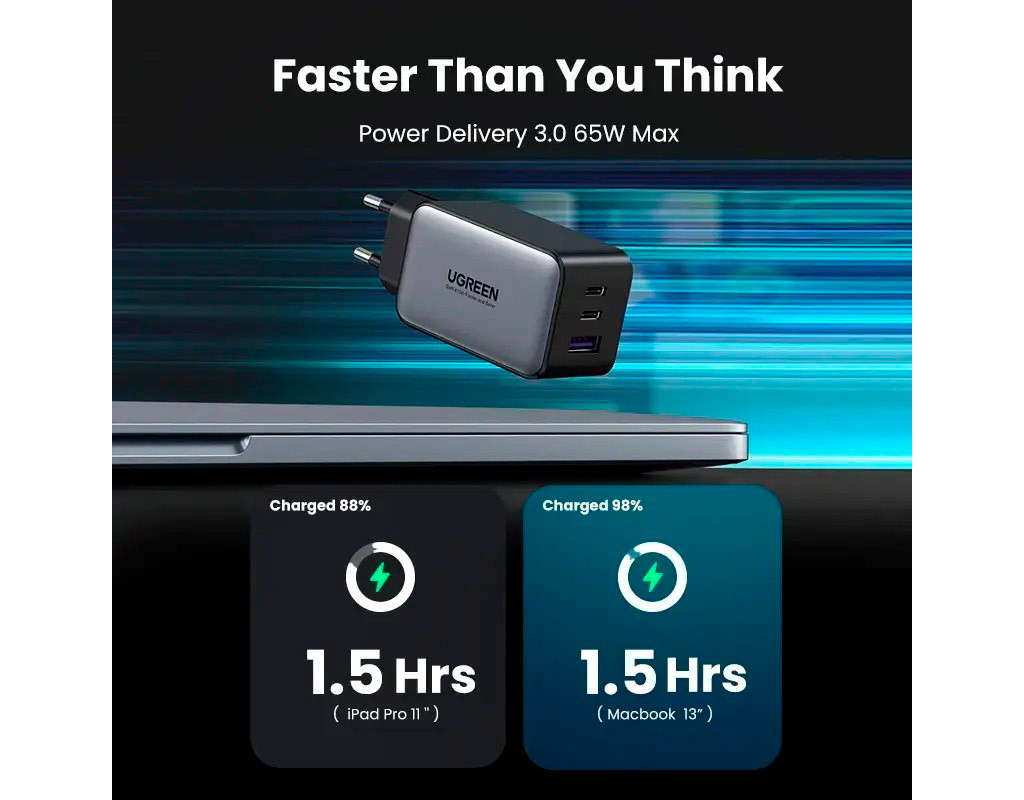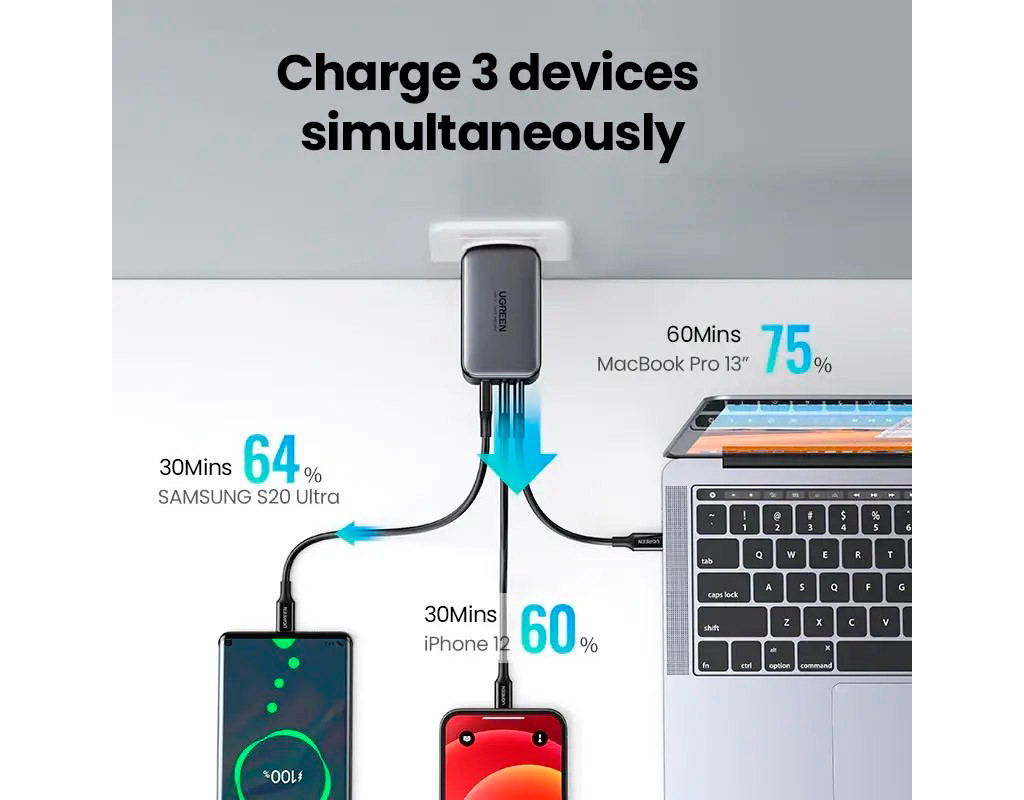 | Зарядний пристрій UGREEN 3xUSB 65W GaN (2хUSB-C+USB-A) CD244 Grey (10335) — ідеальне рішення для сучасних користувачів, які цінують швидкість, надійність та зручність. Завдяки новітній технології GaN (нітриду галію), цей адаптер пропонує покращену ефективність із меншим виділенням тепла, що робить його більш безпечним і довговічним у використанні. Його компактний та легкий корпус дозволяє без зусиль зберігати пристрій у сумці, будь то для подорожей або щоденного використання. Пристрій оснащено трьома портами: два USB Type-C та один USB-A, що надає змогу одночасно заряджати декілька пристроїв. Підтримка стандартів Quick Charge 3.0 та Power Delivery 3.0 гарантує, що ваші пристрої будуть заряджені максимально швидко. Максимальний вихідний струм у 5 А і потужність в 65 Вт дозволяють цьому зарядному пристрою ефективно справлятися навіть із найвибагливішими завданнями, забезпечуючи живлення універсального призначення: від смартфонів і планшетів до ноутбуків. Інтелектуальна система розподілу електроенергії автоматично підлаштовує потужність під потреби вашого пристрою, захищаючи його від перенапруги та короткого замикання. Це означає, що ви можете довіряти UGREEN свій смартфон чи ноутбук без вагань. Придбавши цей зарядний пристрій, ви отримаєте не лише високоякісний продукт, але й оптимізуєте процес зарядки своїх гаджетів. Нема більше необхідності обирати між якістю та зручністю — з UGREEN ви отримуєте обидва ці фактори. |