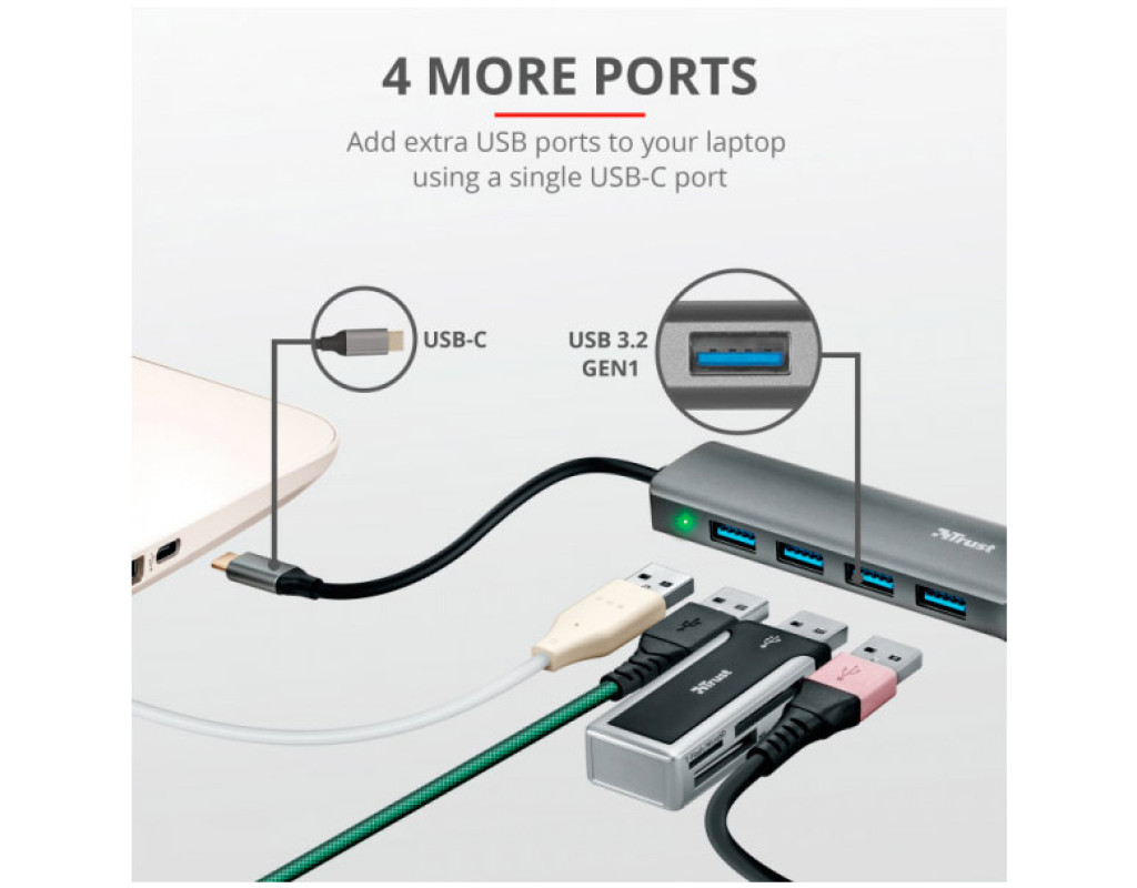 Trust Halyx 4 Port USB 3.2 стильний алюмінієвий USB-концентратор додає до вашого комп'ютера 4 додаткові порти USB-A зі швидкістю 5 Гбіт/с