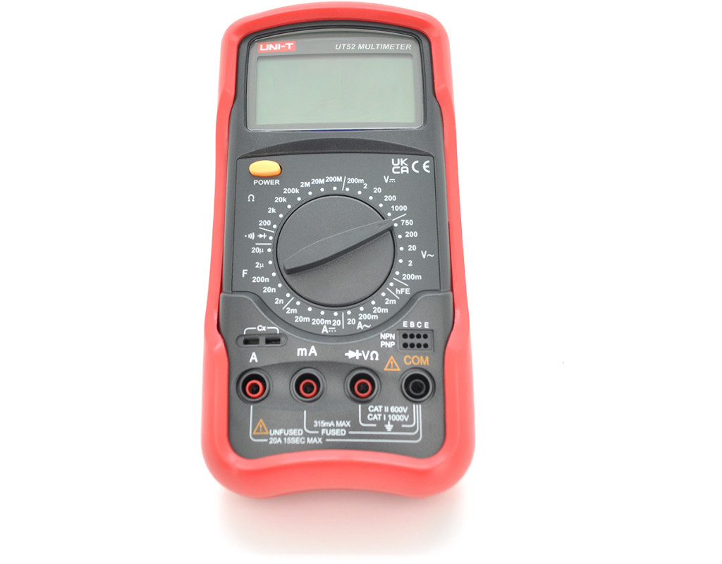 | Мультиметр UNI-T UT52 – це надійний та зручний у використанні прилад для вимірювання різних електричних параметрів. З його допомогою ви зможете проводити вимірювання напруги, струму, опору, ємності та інших важливих характеристик електричних кіл. Використання: - Перевірка напруги та струму в електричних ланцюгах. - Вимір опору для перевірки цілісності проводів та з`єднань. - Визначення ємності конденсаторів. - Діагностика електричних пристроїв та обладнання. - Вимірювання параметрів електричних кіл у домашніх та професійних умовах. Характеристики: - Постійна напруга: до 1000 В - Змінна напруга: до 750 В - Постійний струм: до 20 А - змінний струм: до 20 А - Опір: до 200 МОМ - Місткість: до 20 мкФ - Джерело живлення: батарея 9В (6F22) - Розмір дисплея: 5.9 х 2.5 - Максимальне число на дисплеї, що індикується: 1999 - Стандарти: IEC 101-1; CAT I 1000 V; CAT II 600 V; CAT III 300 V - Торгова марка: UNIT - Розміри: 19 x 8.8 x 3.4 см - Вага: 270 г Комплектація: - Мультиметр UNI-T UT52 - Технічний опис - Щупи - Батарейка 9В - Картонна упаковка Мультиметр UNI-T UT52 - це незамінний інструмент для електротехніків, інженерів та любителів електроніки, що забезпечує точні та надійні вимірювання електричних параметрів. |