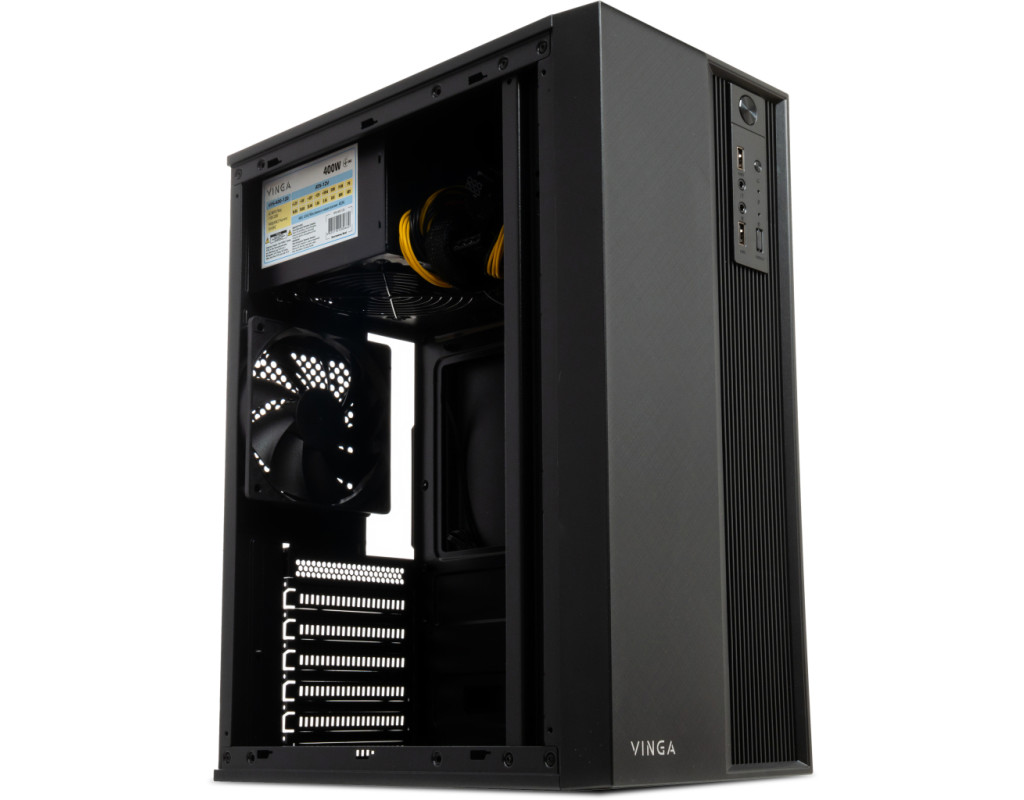 Корпус Vinga CS113 – класичне рішення для малопотужних ПК. У ньому можна зібрати комп'ютер для особистого кабінету або офісу. Він незамінний там, де не потрібна високопродуктивна оргтехніка. Модель має дуже компактні габарити, при цьому в ній є все, що потрібно, включаючи вбудований блок живлення на 400 Вт, оснащений кулером. Такої потужності БЖ з лишком достатньо для задоволення потреб інтегрованих відеоадаптерів. Вентиляційні решітки розміщені на тильній панелі, а також у вигляді невеликого перфорованого віконця на передній та правій бічній стіні. Обмеження для внутрішніх деталей досить стандартні – це: