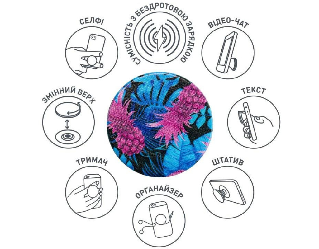 Забезпечує надійне зчеплення, щоб ви могли надсилати текстові повідомлення однією рукою, знімати кращі фотографії та переглядати відео. Функціонує як зручна підставка, завдяки якій ви можете переглядати відео або робити селфі. Надійна липучка 3М приклеюється до більшості пристроїв та чохлів. Розміри: діаметр 39,74 мм х 7 мм і 24,25 мм в розкладеному вигляді |
