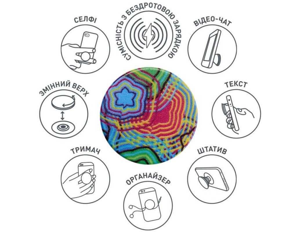 Забезпечує надійне зчеплення, щоб ви могли надсилати текстові повідомлення однією рукою, знімати кращі фотографії та переглядати відео. Функціонує як зручна підставка, завдяки якій ви можете переглядати відео або робити селфі. Надійна липучка 3М приклеюється до більшості пристроїв та чохлів. Розміри: діаметр 39,74 мм х 7 мм і 24,25 мм в розкладеному вигляді |