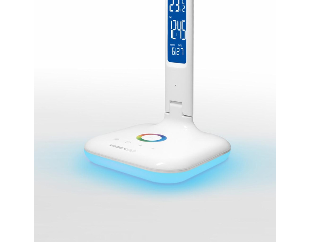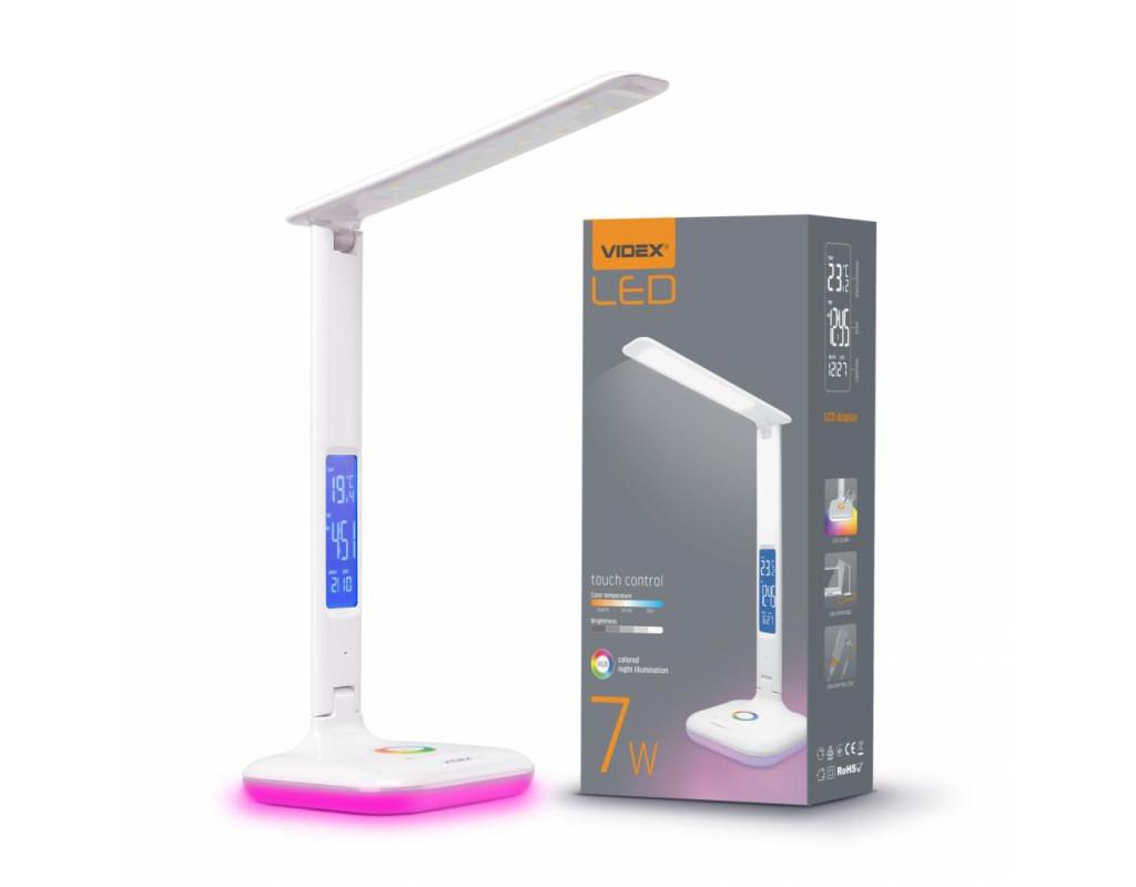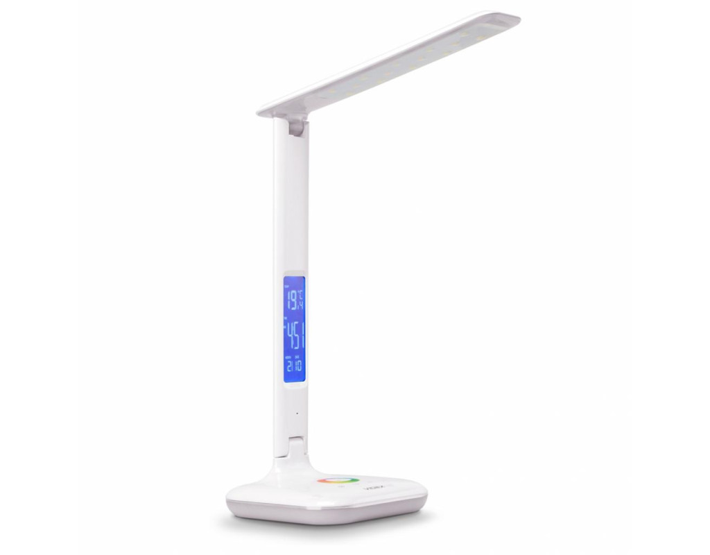 Стиль - модерн, Вид лампи - функціональні, Тип лампи - LED-стрічка, Кріплення - підставка, вбудована (незамінна), Вимикач - сенсорний, ні, так, Особливості - годинник, календар, термометр, будильник, RGB - підсвітка, Матеріал - метал, пластик, Колір - білий