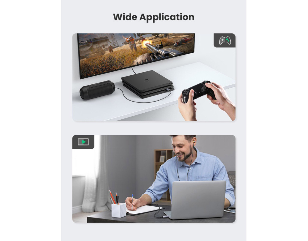 Чудова якість звуку Зовнішній звуковий адаптер USB використовує передову технологію C-Media IC для оптимальної якості звуку та продуктивності пристрою. Це дозволяє повністю обійти звукову карту або аудіороз'єм комп'ютера, що вийшла з ладу, і відновити функціонування аудіосистеми. Інтелектуальний чіп Вбудований передовий смарт-чіп підтримує автоматичне розпізнавання американських та національних стандартних гарнітур, не має системних та стандартних обмежень, ефективно декодує звуковий сигнал, забезпечує мінімальний рівень спотворень, пропонуючи вам найкращий рівень прослуховування. Компактний та портативний Тонкий розмір із ультракомпактним дизайном та міцним алюмінієвим корпусом, Plug and Play, не вимагає драйверів та живиться від порту USB. Універсальна сумісність Ця зовнішня звукова карта може працювати з будь-якою стандартною системою з підтримкою USB Audio Class, включаючи Windows 10/8.1/8/7/Vista/XP, Mac OS X, Linux, PS5 PS4, Google Chrome book, Windows Surface 3 pro, Raspberry Pi і т.д. Примітки - Цей USB звуковий адаптер призначений для нової гарнітури з 3,5 мм TRRS інтерфейсом. Він не працює з гарнітурами з окремими навушниками та мікрофоном з 3,5-мм аудіопортом.