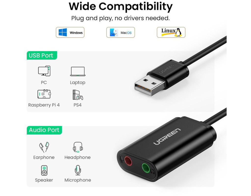 Ugreen USB Audio Adapter містить вихідний роз'єм для стереонавушників і вхідний роз'єм для монофонічного мікрофона. Він може обійти несправну звукову карту або несправний аудіопорт 3,5 мм вашого ноутбука/настільного комп'ютера та відновити для вас функцію звуку. Заощаджуйте на заміні звукової карти, що вийшла з ладу. Тим часом деякі ноутбуки або ультрабуки об'єднують навушники та мікрофон тільки в один 3,5-мм аудіороз'єм. За допомогою цього USB-адаптера ваша традиційна гарнітура, як і раніше, може використовуватися на ваших ноутбуках. |