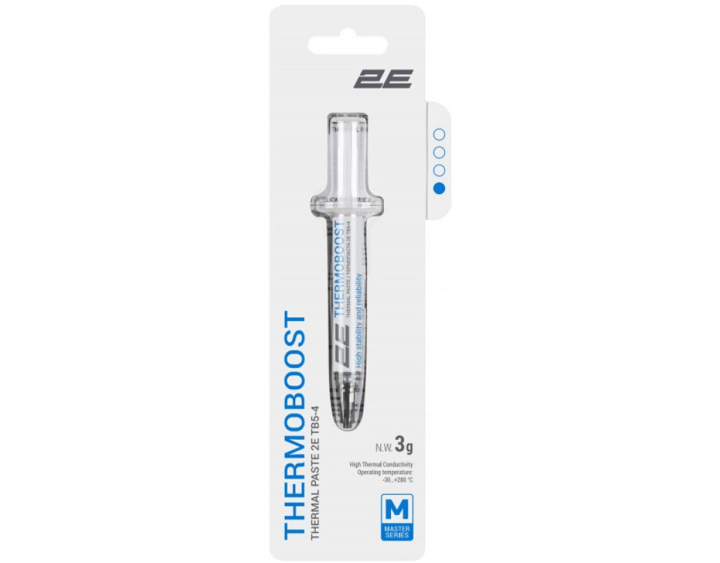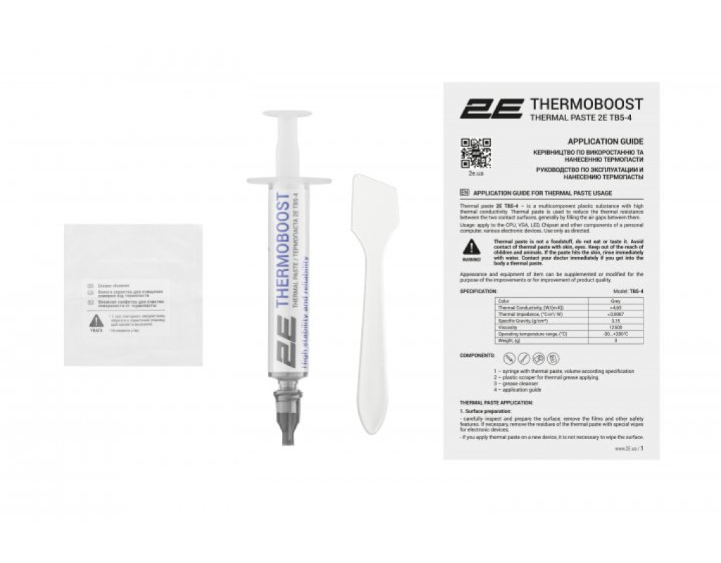 | Термопаста 2E TB5-4 — багатокомпонентна пластична речовина з високою теплопровідністю. Термопаста використовується для зменшення теплового опору між двома дотичними поверхнями, а саме завдяки заповненню повітряних проміжків між ними. |