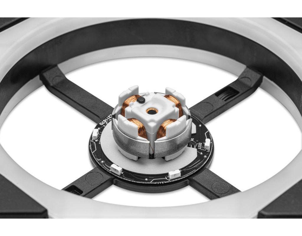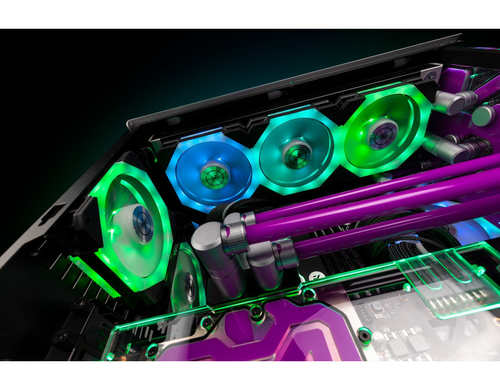 EK-Quantum Impulse 120 D-RGB - це безшумний 120-мм вентилятор для охолодження комп'ютера, розроблений і виготовлений, в першу чергу, з урахуванням найяскравішого світлодіодного RGB-підсвічування. Вони не є заміною іншим вентиляторам EK, які зосереджені на високій продуктивності радіатора, а радше естетичною пропозицією, що забезпечує безшумну роботу та збалансовану продуктивність. Три зони преміум-класу зі світлодіодним підсвічуванням На відміну від інших вентиляторів EK, які мають світлодіоди виключно на роторі, вентилятори Impulse мають додаткові світлодіоди з обох боків рами. MagLev і підшипник Vapo Підшипник Vapo додає магнітний ефект (магнітну левітацію) до підшипника, щоб зменшити шум і підвищити стабільність вала. Квадратна рама для фокусування повітряного потоку Практична квадратна форма рами вентилятора забезпечує оптимальну продуктивність у режимі втягування або виштовхування без гідравлічних втрат, що гарантує оптимальну потужність охолодження ваших радіаторів рідинного охолодження. Стандартні роз'єми D-RGB Освітлення D-RGB вентилятора EK-Quantum Impulse 120 не потребує додаткового дорогого контролера, щоб ви могли насолоджуватися яскравими світловими ефектами. Все, що вам потрібно - це простий 3-контактний 5В адресний роз'єм D-RGB для стандартних контролерів або будь-якої популярної технології синхронізації D-RGB (ARGB) від основних виробників материнських плат. OmniLink Можливість послідовного підключення живлення вентиляторів, D-RGB і навіть насосів по одному кабелю забезпечує максимальну гнучкість і зменшує кількість кабелів. Усі кабелі мають пласку стрічкову конструкцію без додаткових гільз, що забезпечує ще більшу зручність при прокладанні кабелів. |