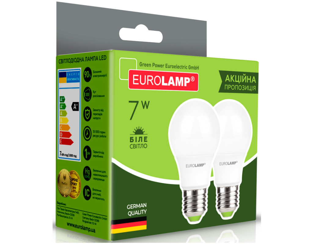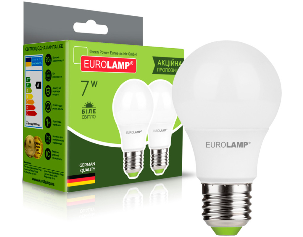 Світлодіодна лампа Eurolamp. Ця модель призначена для заміни ламп ККЛ у промисловому освітленні. Корпус цієї лампи повністю алюмінієвий і обладнаний високоефективними тепловідвідними каналами, що сприяє довгому терміну експлуатації діодів. Лампа витримує перепади напруги в діапазоні 175-250 В без наслідків працездатності. Переваги світлодіодних ламп Eurolamp: