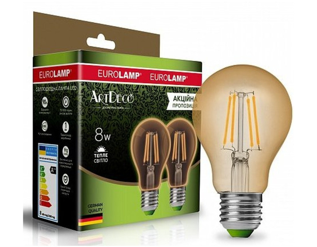 Мультипак "1+1" Eurolamp світлодіодна лампа філамент A60 8W E27 2700K (deco) MLP-LED-A60-08273(Amber)new Мультипак містить 2 світлодіодні лампи філамент A60 8W E27 2700K (deco). Світлодіодна лампа філамент економить до 90% електроенергії. Чудова заміна традиційного освітлення. Не містить ртуті, безпечна для дітей та дорослих.Використовувати у приміщенні! Світлодіодна лампа Eurolamp філамент A60 8W E27 2700K (deco) стане чудовим елементом освітлення та декору в спальні, вітальні, в офісі або магазині. Лампа має потужність 8 Вт і світловий потік 800 люмен, а колірна температура становить 2700К, що забезпечує приємне затишне освітлення теплого білого кольору. Також вона має індекс кольоропередачі Ra - 80 та кут розсіювання світла 200 градусів. Лампа має тип цоколя E27 та призначена для використання у приміщенні. Виготовлена зі скла, має прозору конструкцію та розміри 112 мм висотою та 60 мм діаметром. Робоча температура лампи становить -20 до +40 градусів. |