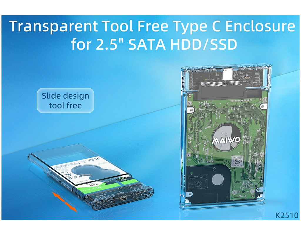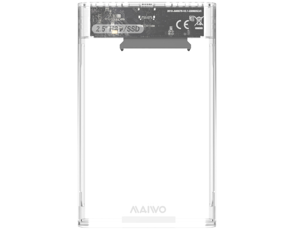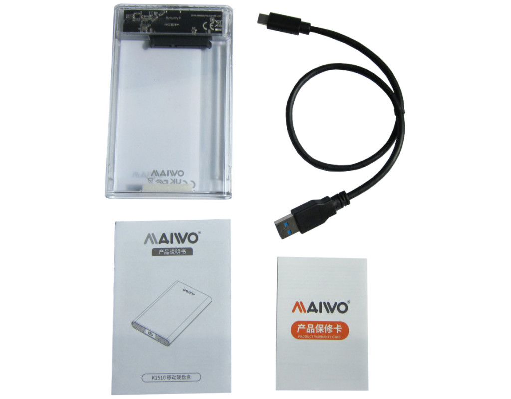 Прозора зовнішня кишеня Maiwo K2510 для 2.5-дюймових дисків SATAI/II/III HDD або SSD з кабелем підключення USB 3.1 Gen1 Type-C - ідеальне рішення для розширення можливостей зберігання даних вашого комп'ютера або ноутбука. Цей корпус легко перетворює 2.5-дюймовий HDD SATA або SSD на портативний зовнішній накопичувач з високою швидкістю передачі даних до 5 Гбіт/с через USB 3.1.