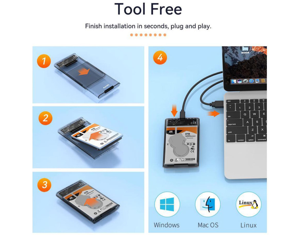 Завдяки простій конструкції зовнішньої кишені та безгвинтовому засувному механізму кріплення жорсткого диска в кишені, для підключення накопичувачів вам не знадобляться інструменти.
