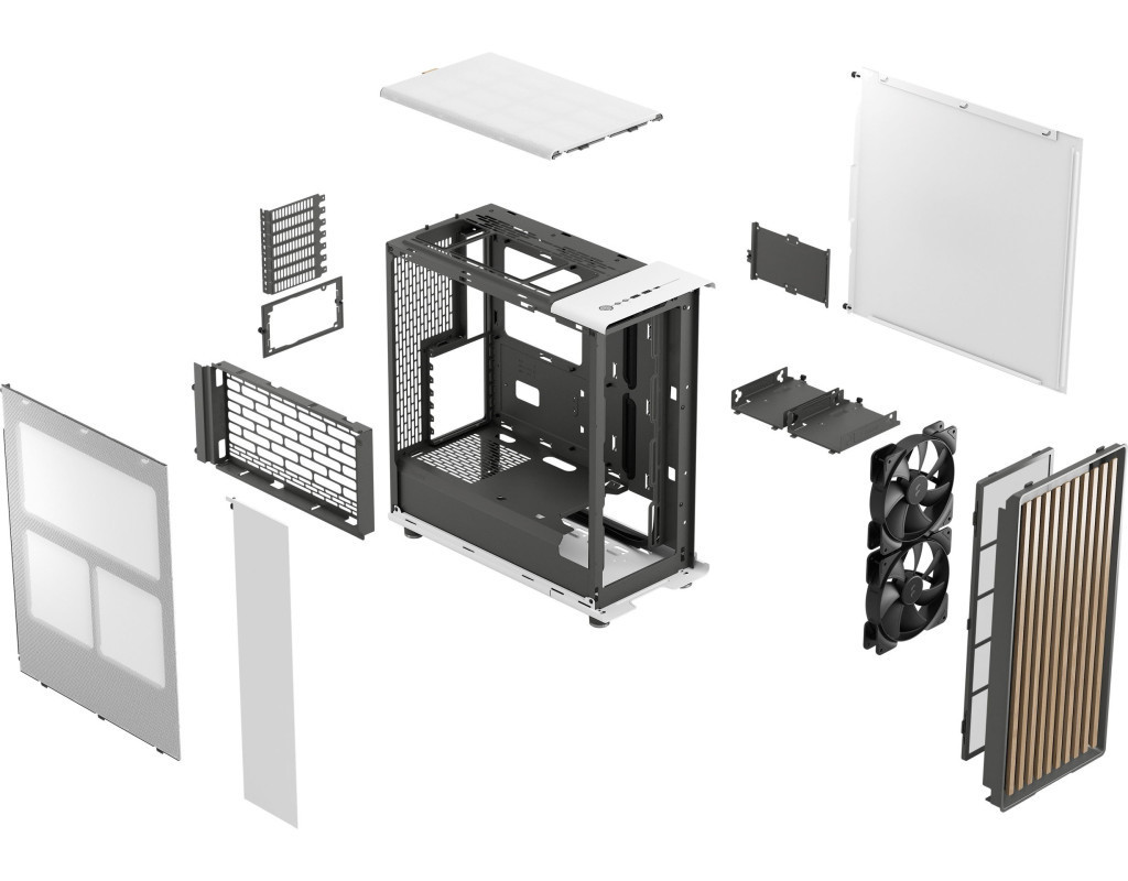 Fractal Design North переосмислює ігровий ПК, використовуючи натуральні матеріали та виготовлені на замовлення деталі, щоб зробити ігри стильним доповненням до житлового простору. Поєднуючи в собі дизайн та інженерію повітряних потоків, корпус оснащений вентиляційною сіткою з дрібним візерунком та відкритою передньою панеллю зі справжнього горіха або дуба. Дизайн доповнюють витончені деталі з латуні або сталі та інтегрована вкладка для легкого доступу до верхньої частини корпусу. Усередині North пропонує інтуїтивно зрозуміле внутрішнє планування та широку сумісність. Особливості моделі: