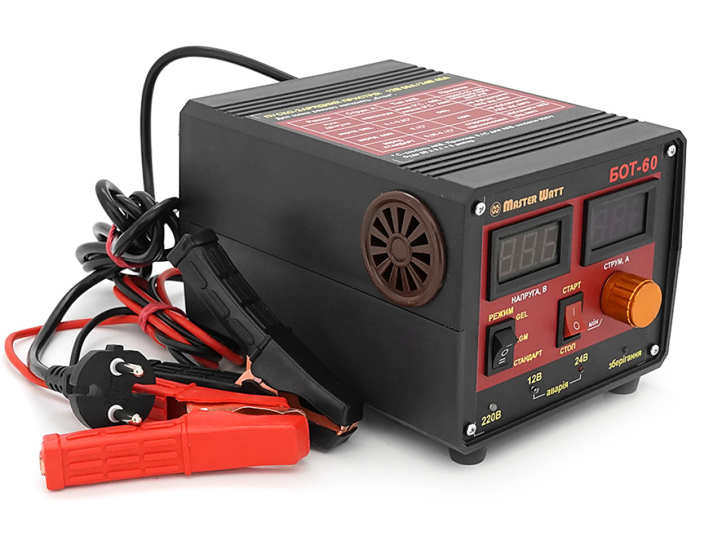 Пуско-зарядне ЗУ БОТ-60 для акумуляторів 12 / 24V (12-900Ah) (MF, WET, AGM, GEL, CA / CA), 160-245V, Струм заряду 60 / 40А, крокодили в комплекті