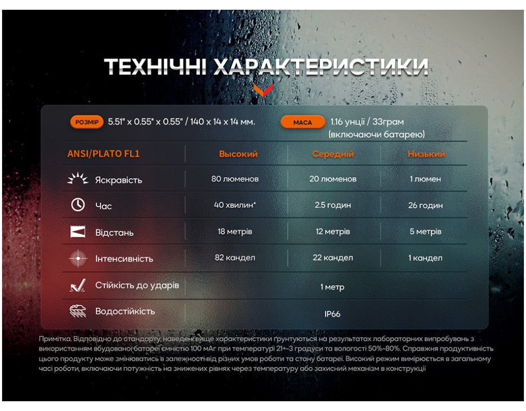 • Розміри ліхтаря: 140х14х14 мм; важить 33 гр (разом із акумулятором).